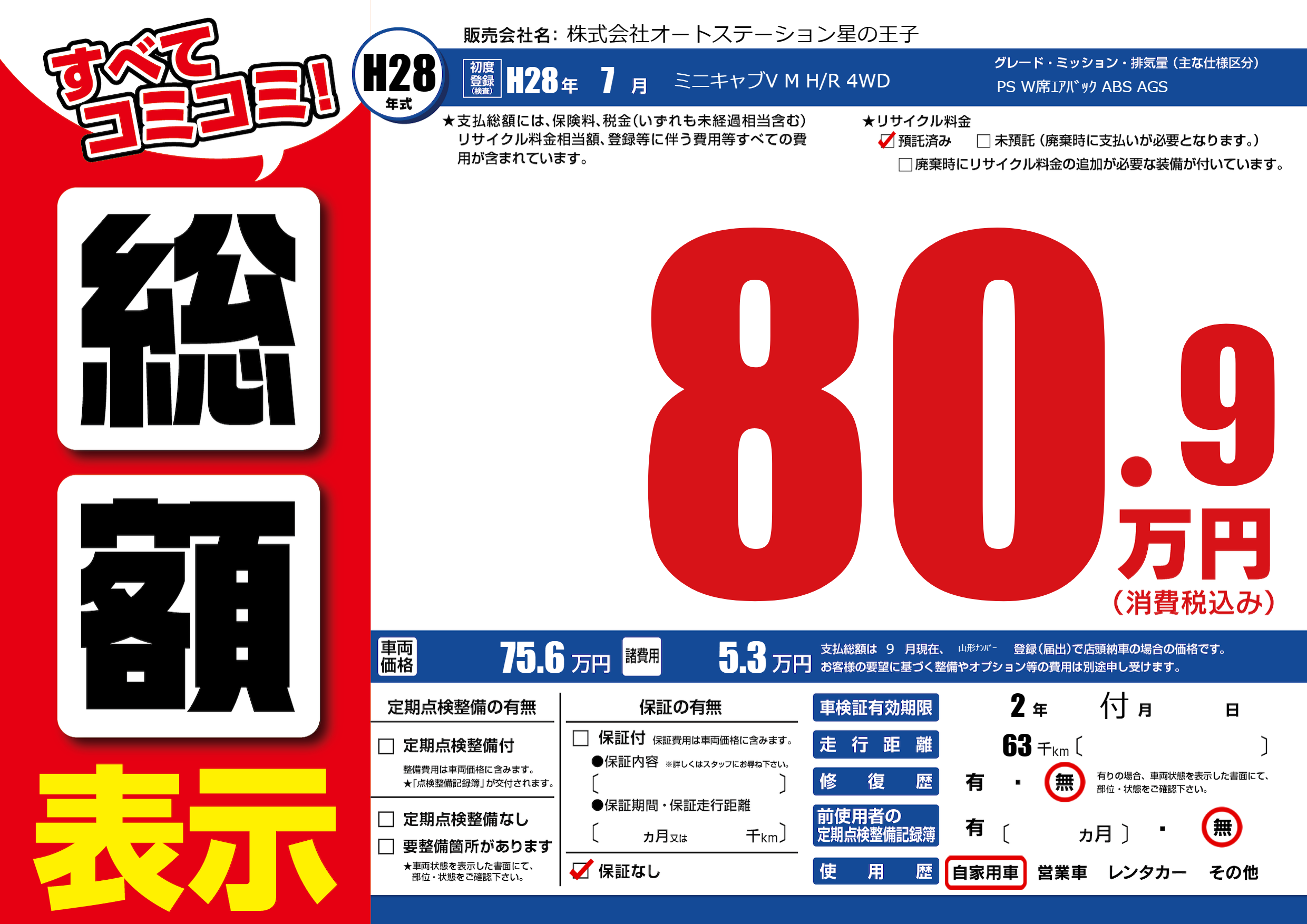 | 走行キロ | 6.3万km | 初年度登録 | H28年7月 |