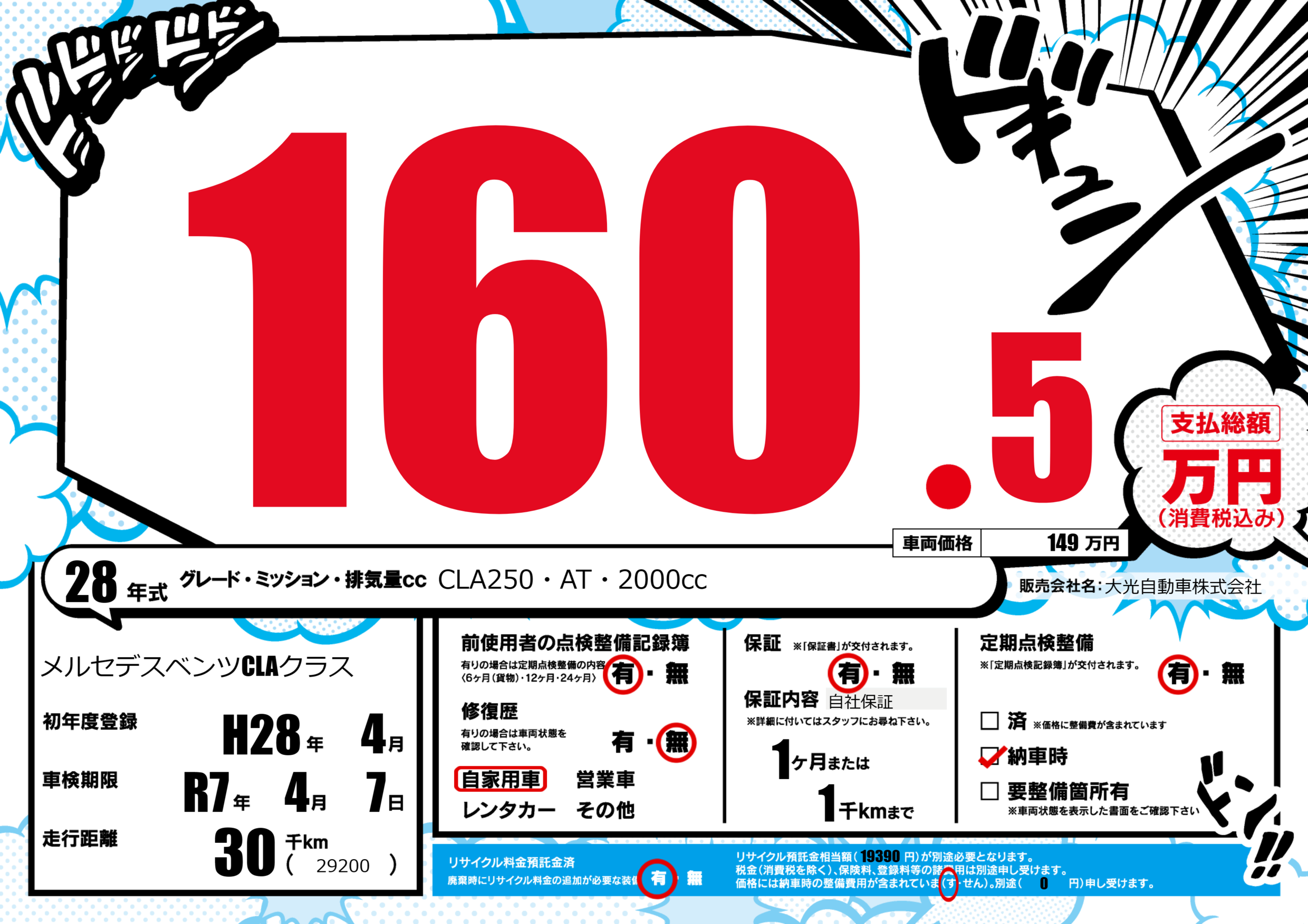 | 車名 | メルセデスベンツCLAクラス | グレード ミッション 排気量 |