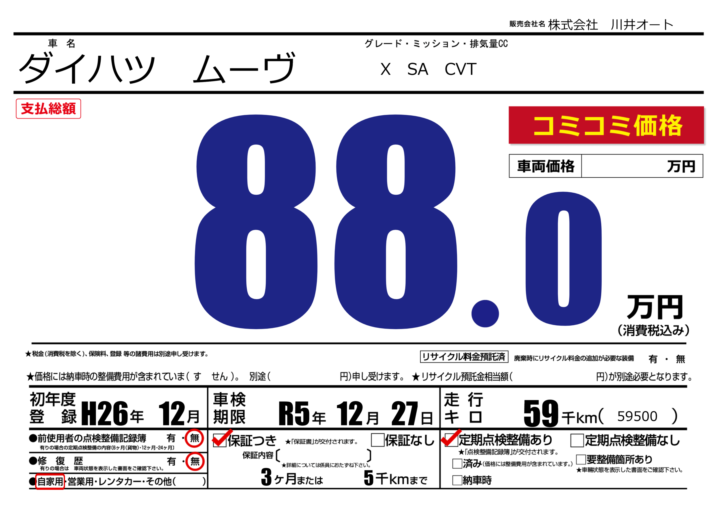 | 車名 | ダイハツ ムーヴ | グレード ミッション 排気量 |