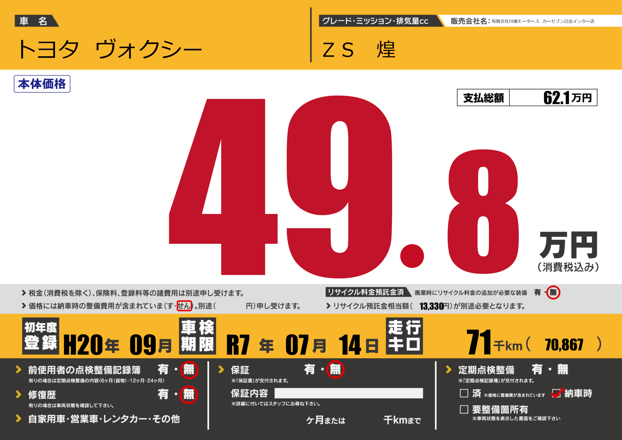 | 走行キロ | 7.1万km | 初年度登録 | H20年09月 |