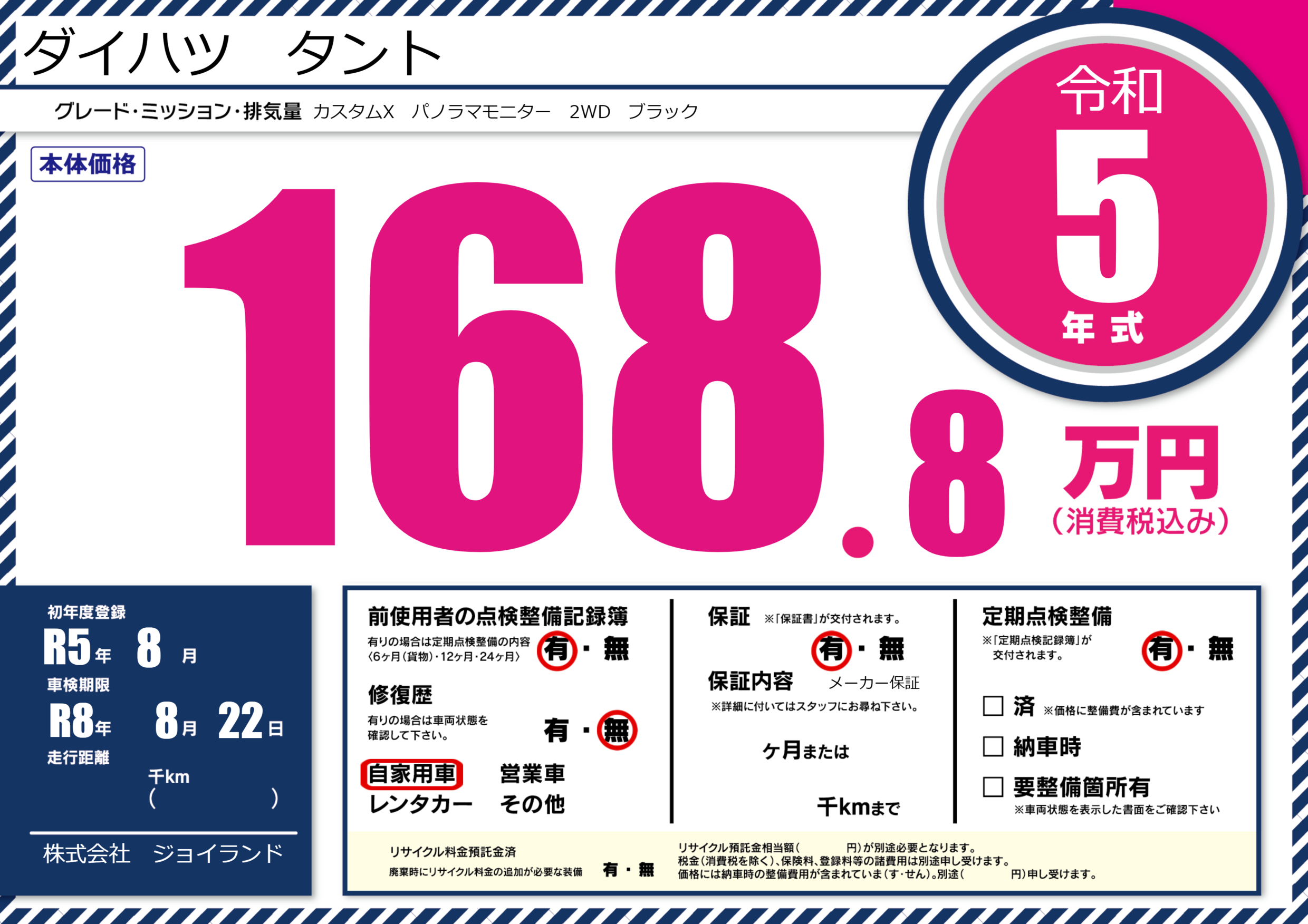 | 車名 | ダイハツ タント | グレード ミッション 排気量 |