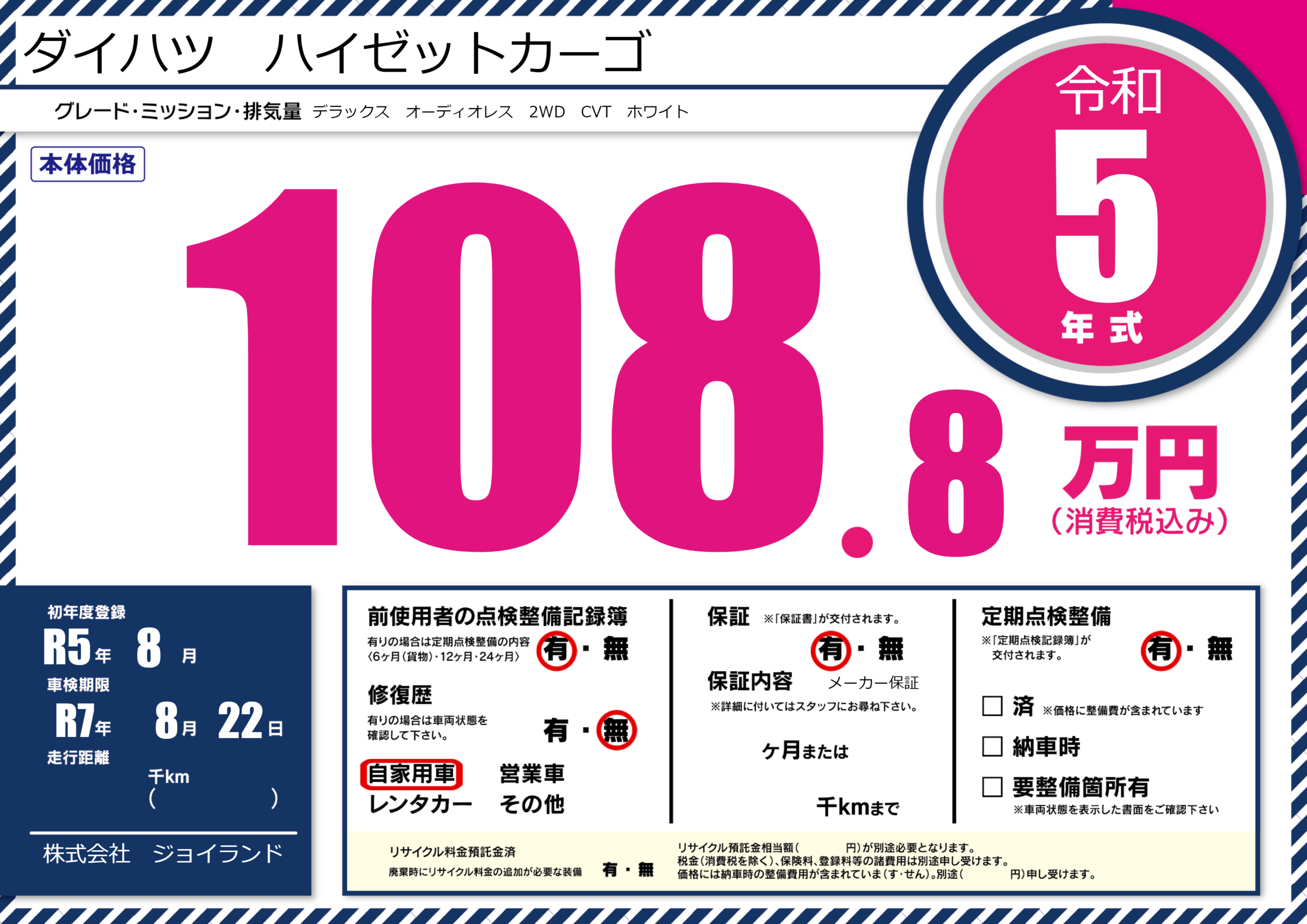 | 車名 | ダイハツ ハイゼットカーゴ | グレード ミッション 排気量 |