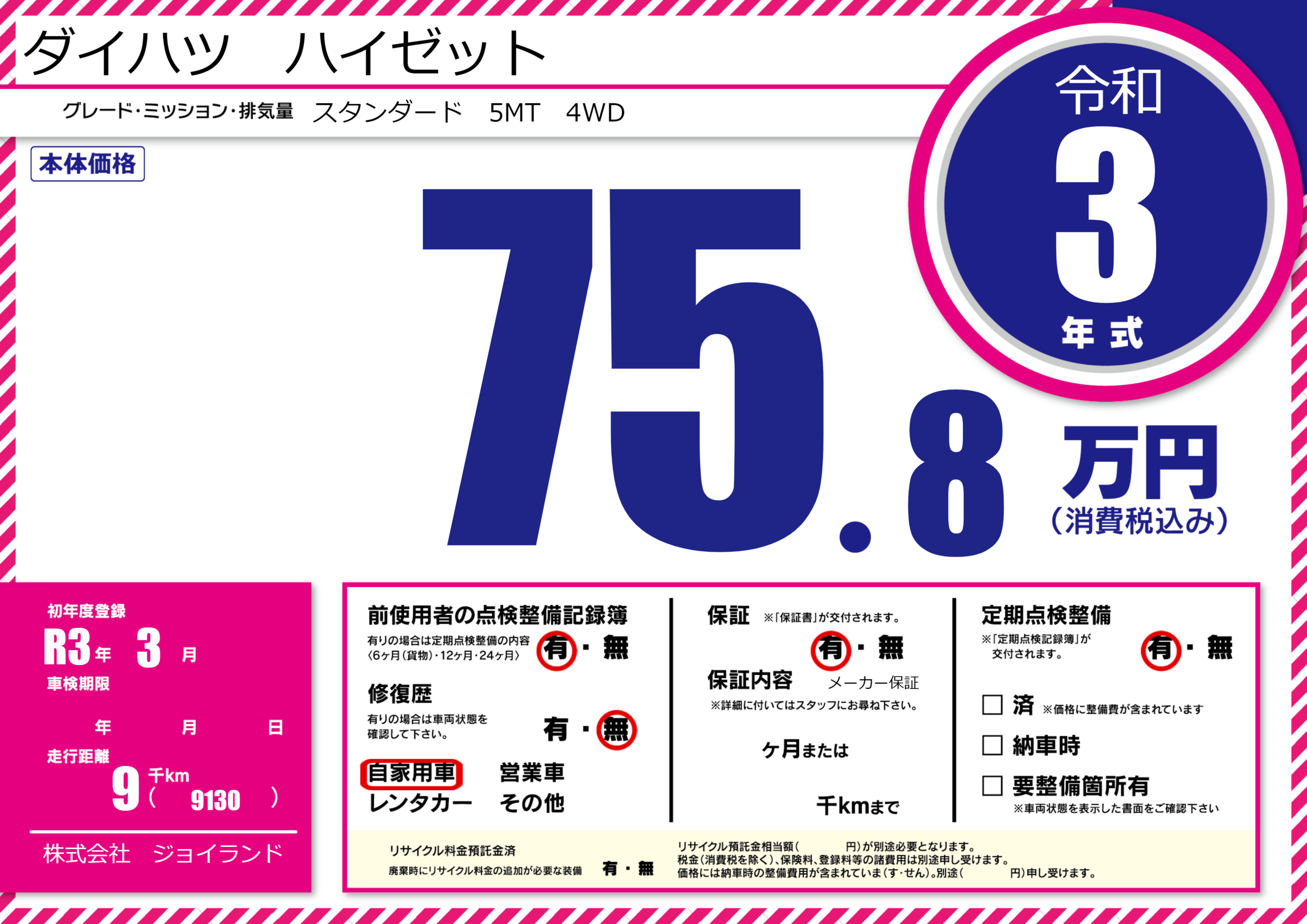 | 車名 | ダイハツ ハイゼット | グレード ミッション 排気量 |