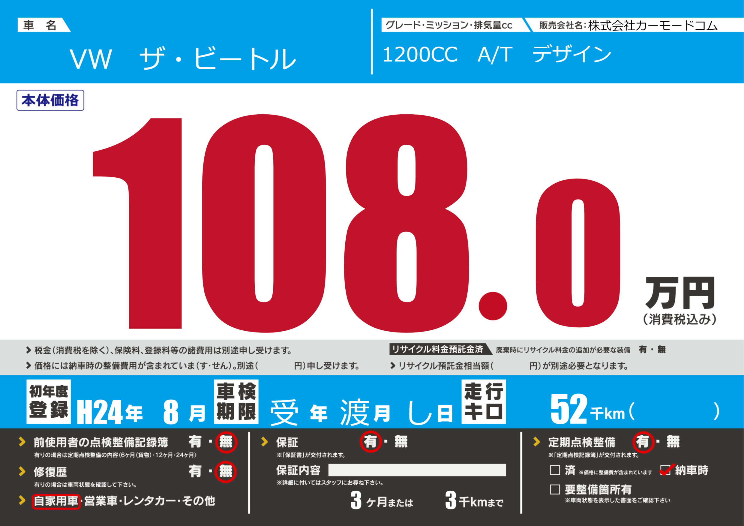 | 車名 | VW ザ・ビートル | グレード ミッション 排気量 |