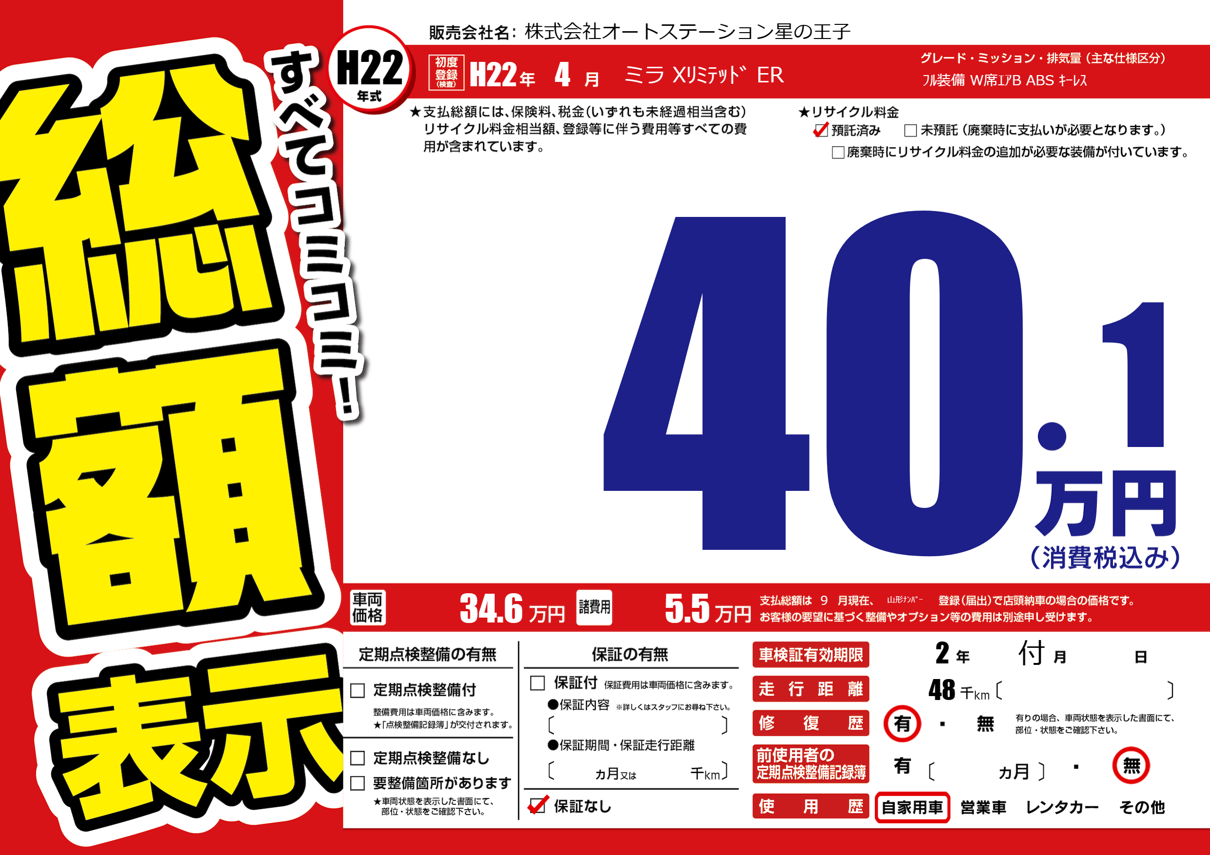 | 走行キロ | 4.8万km | 初年度登録 | H22年4月 |