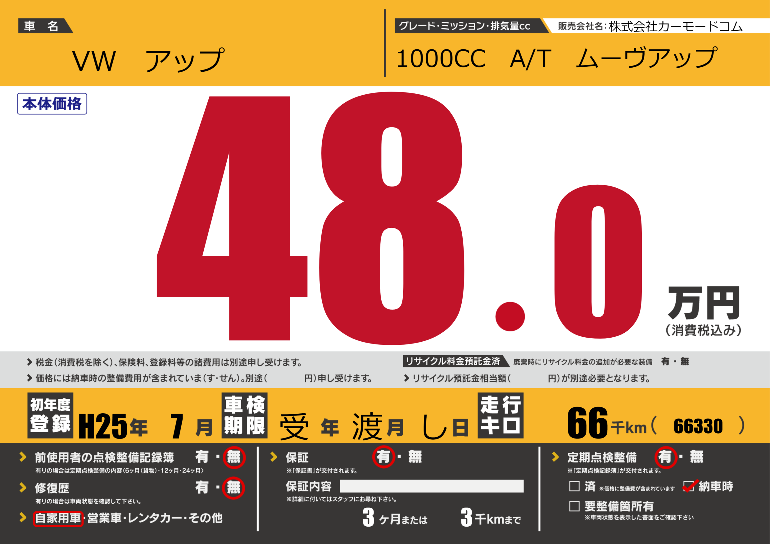 | 車名 | VW アップ | グレード ミッション 排気量 |