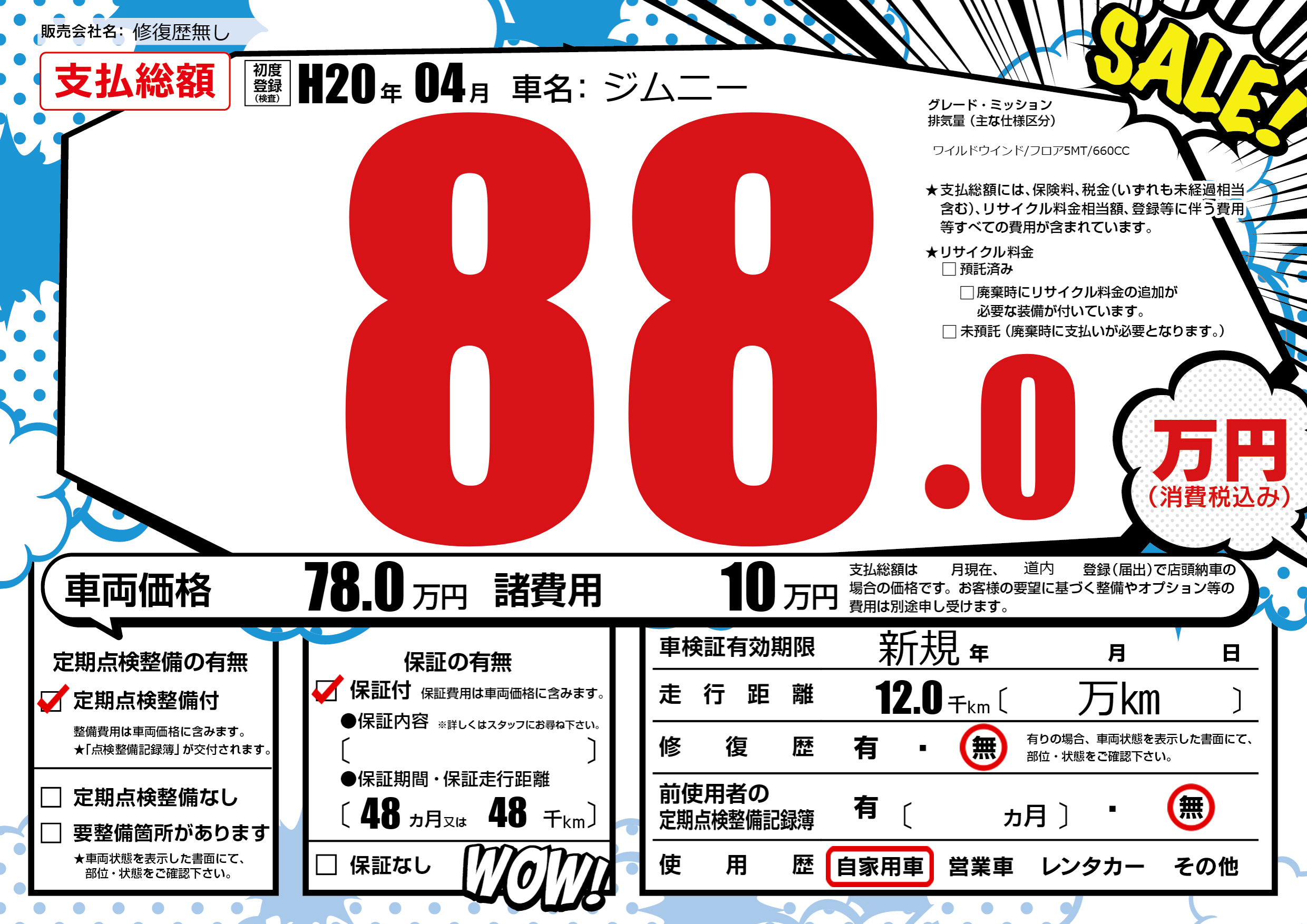 | 車名 | ジムニー | グレード ミッション 排気量 |
