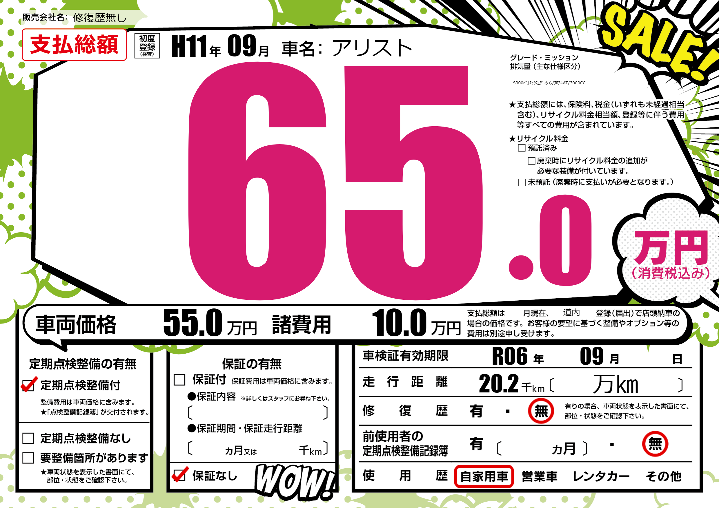 | 車名 | アリスト | グレード ミッション 排気量 |