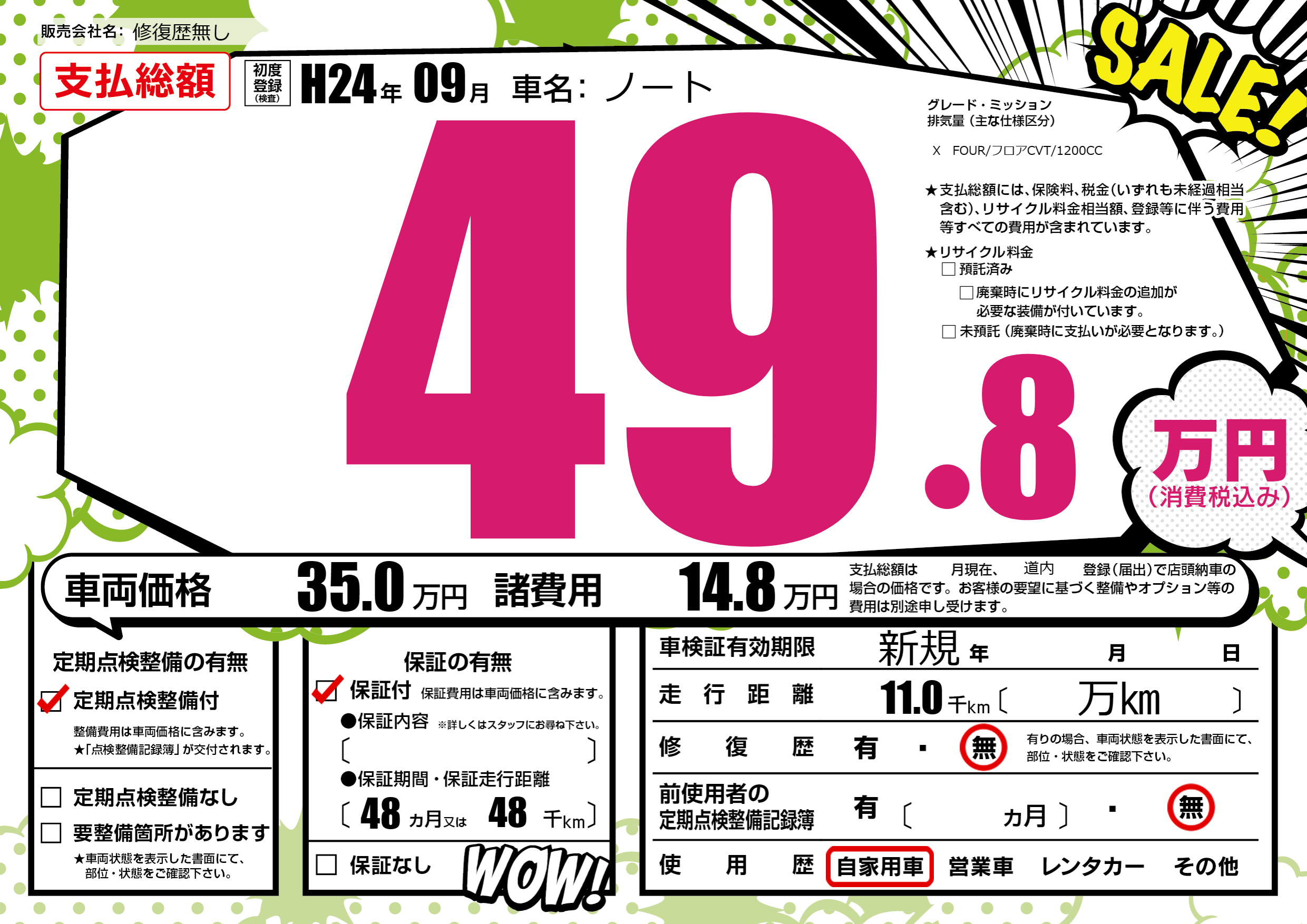 | 走行キロ | 1.1万km | 初年度登録 | H24年09月 |
