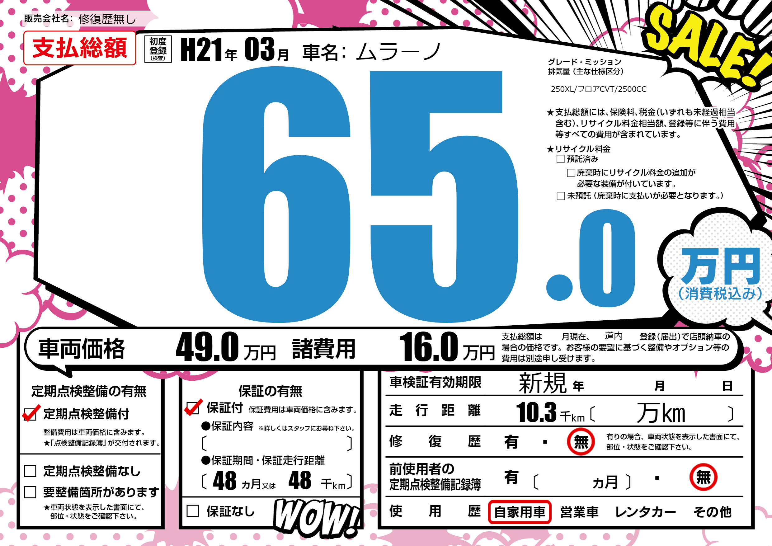 なし | 車検制限 | 新規年---月---月 |