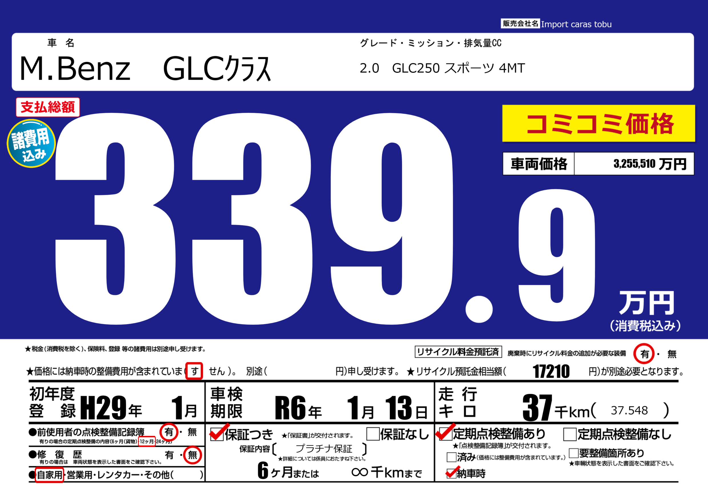 | 車名 | M.Benz GLCクラス | グレード ミッション 排気量 |
