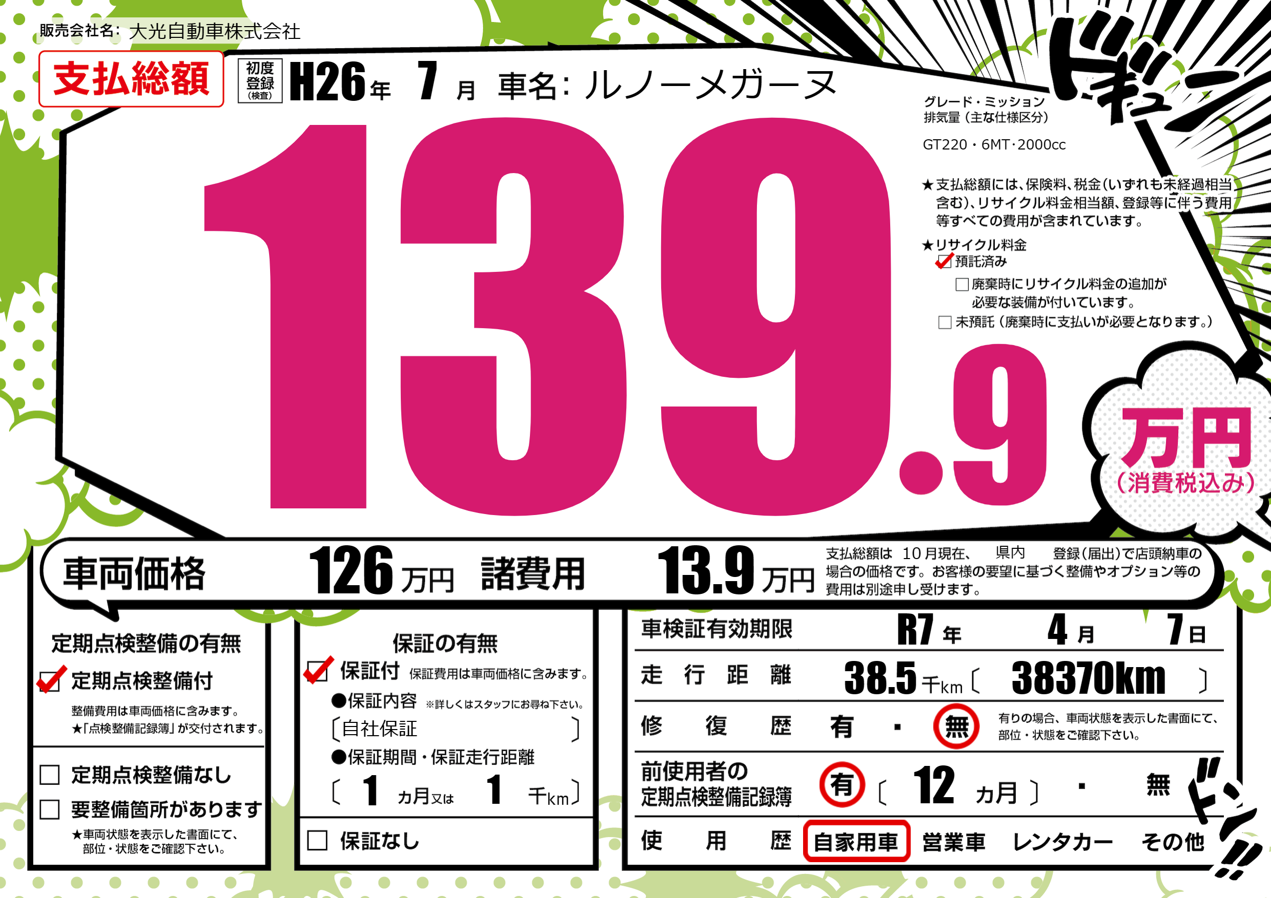 | 走行キロ | 3.8万km | 初年度登録 | H26年7月 |