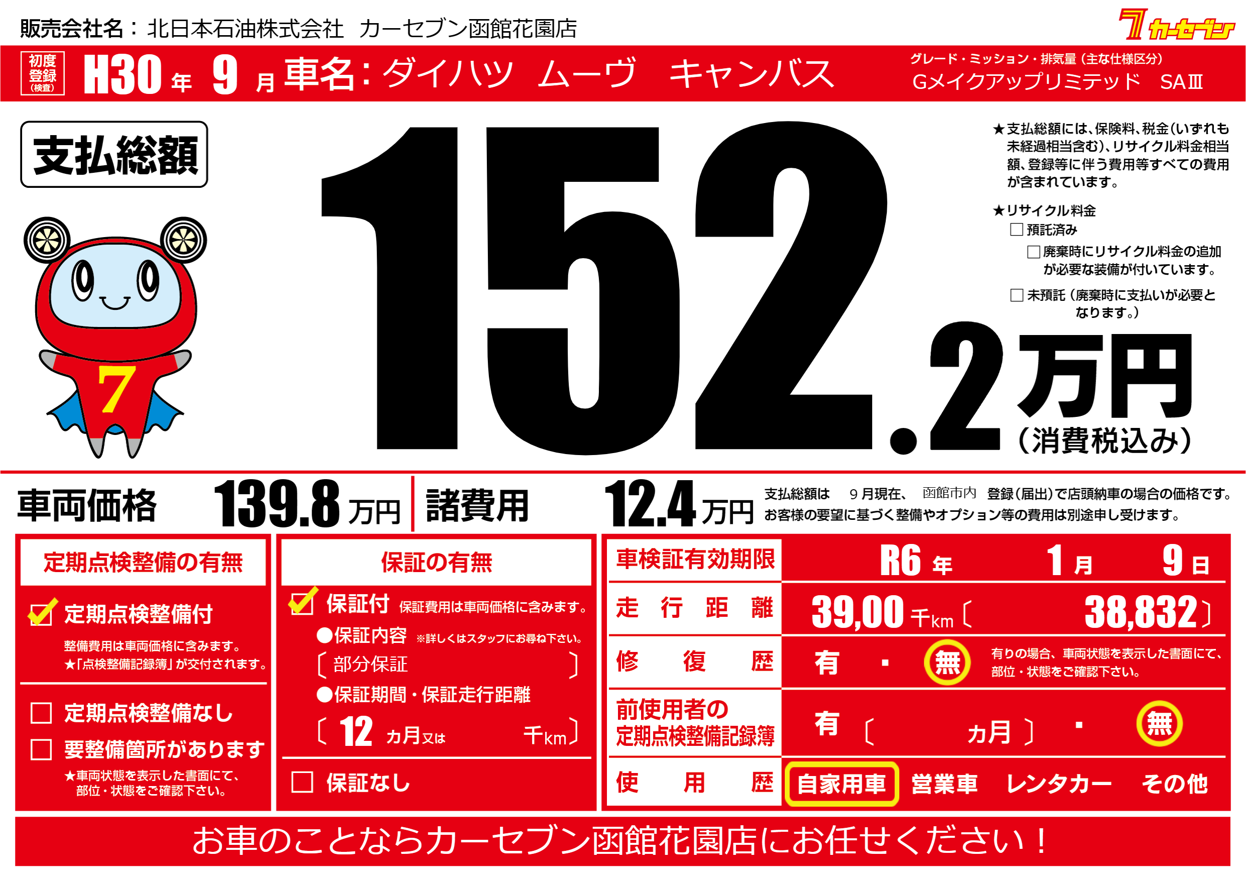| 走行キロ | 3.9万km | 初年度登録 | H30年9月 |