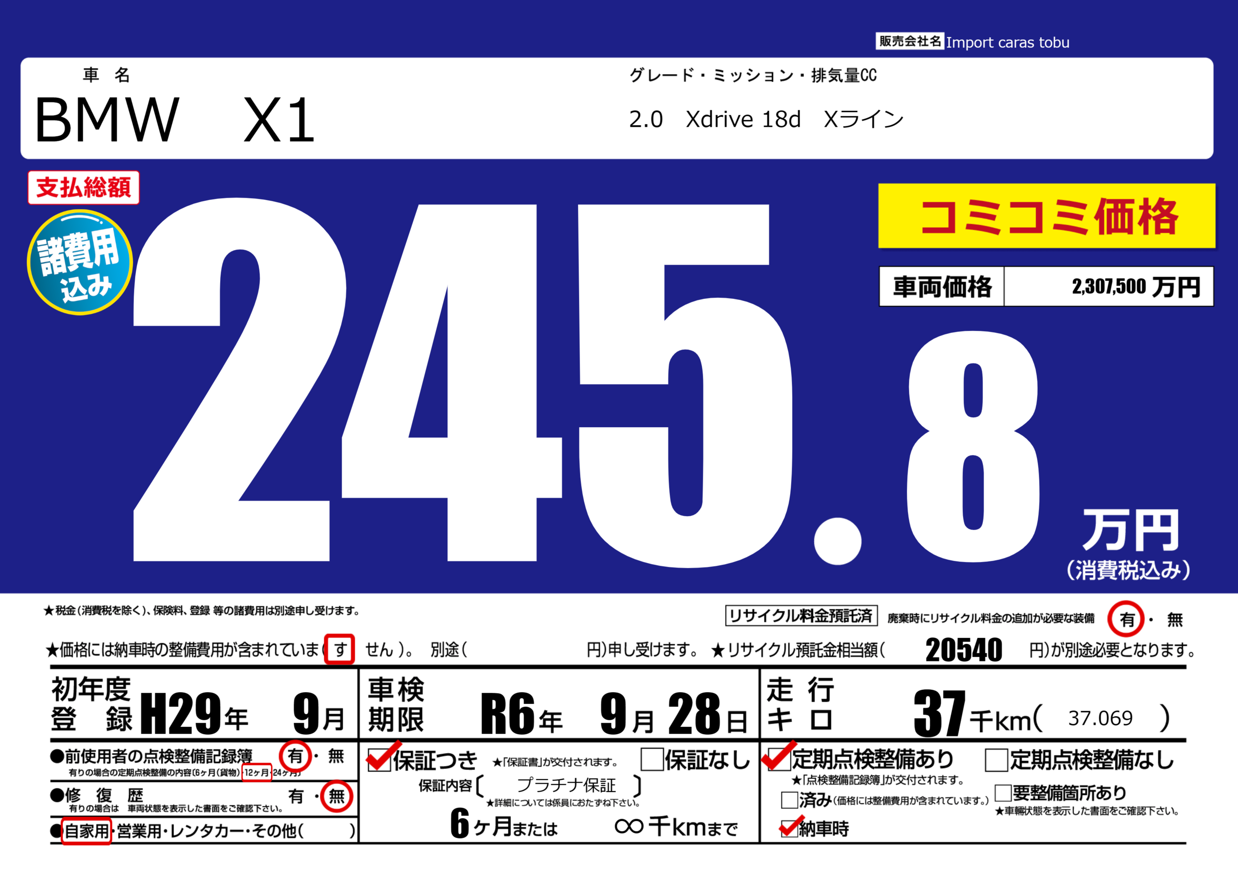 | 車名 | BMW X1 | グレード ミッション 排気量 |