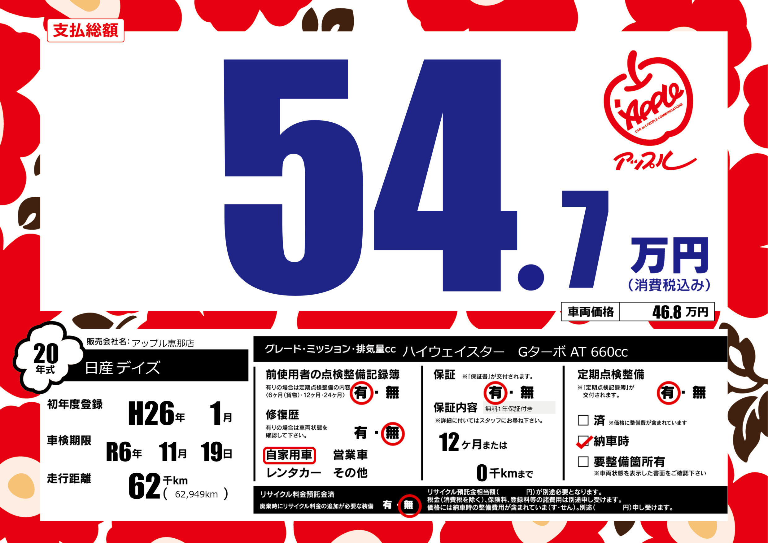 | 車名 | 日産 デイズ | グレード ミッション 排気量 |