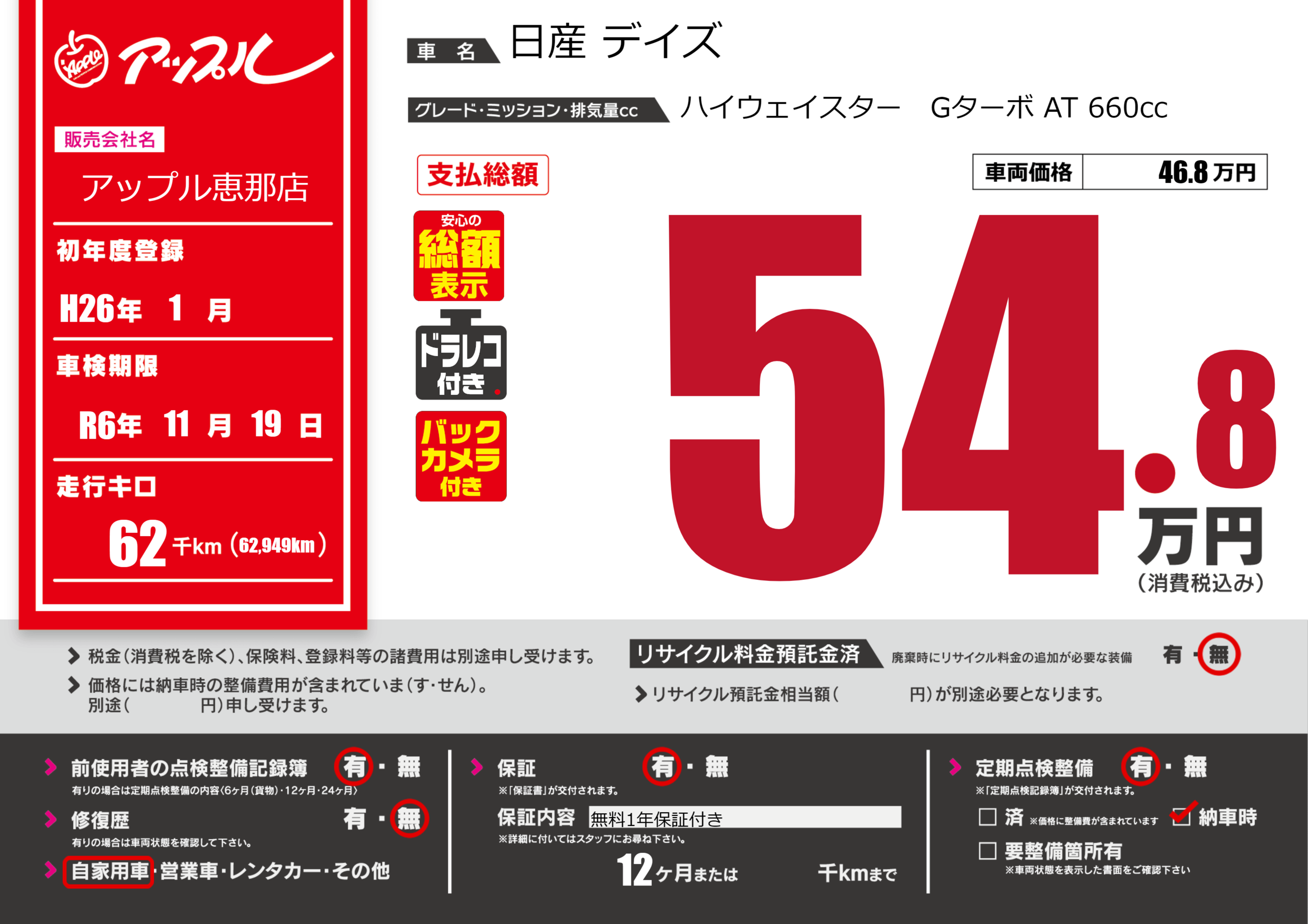 | 車名 | 日産 デイズ | グレード ミッション 排気量 |