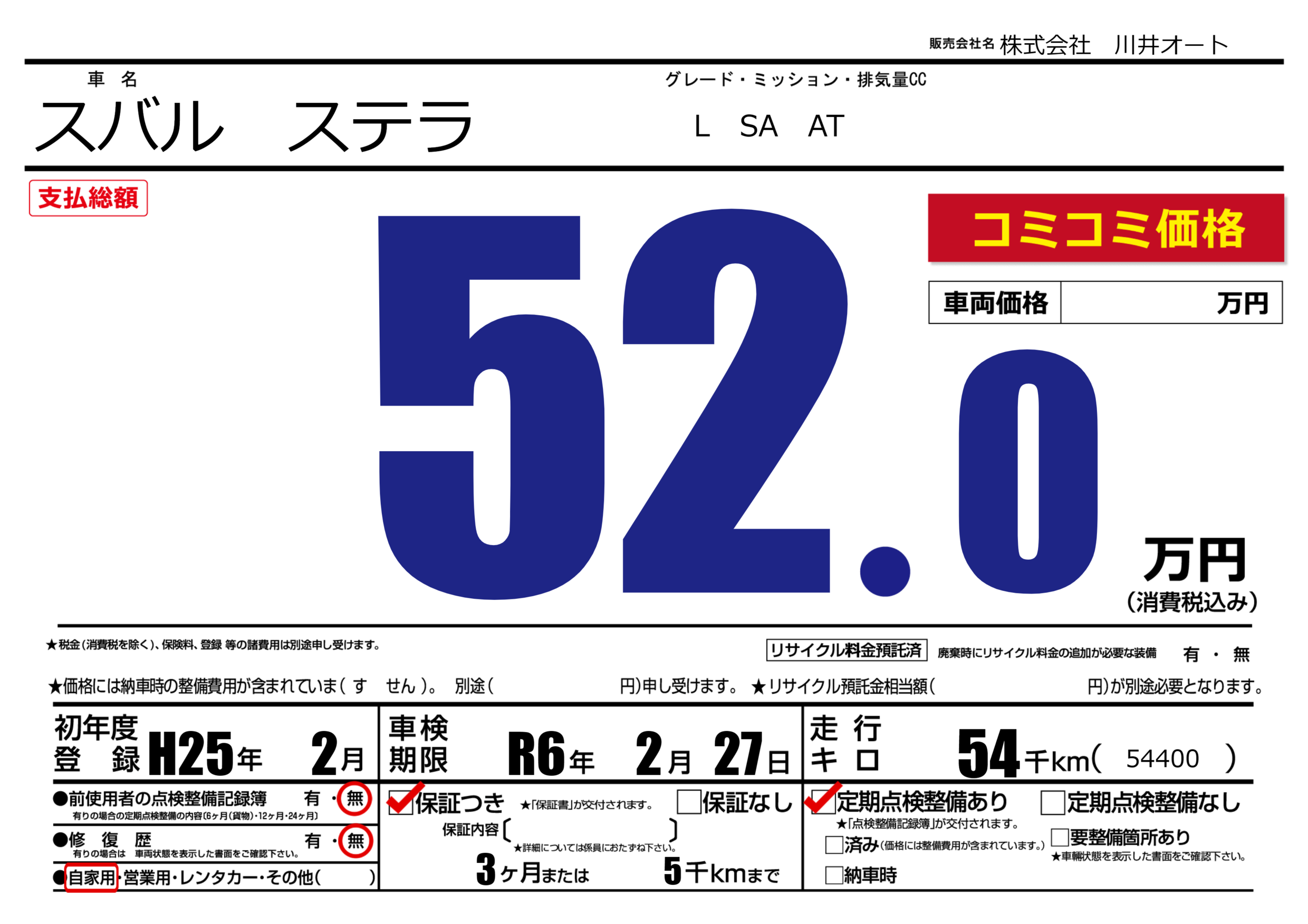 | 車名 | スバル ステラ | グレード ミッション 排気量 |