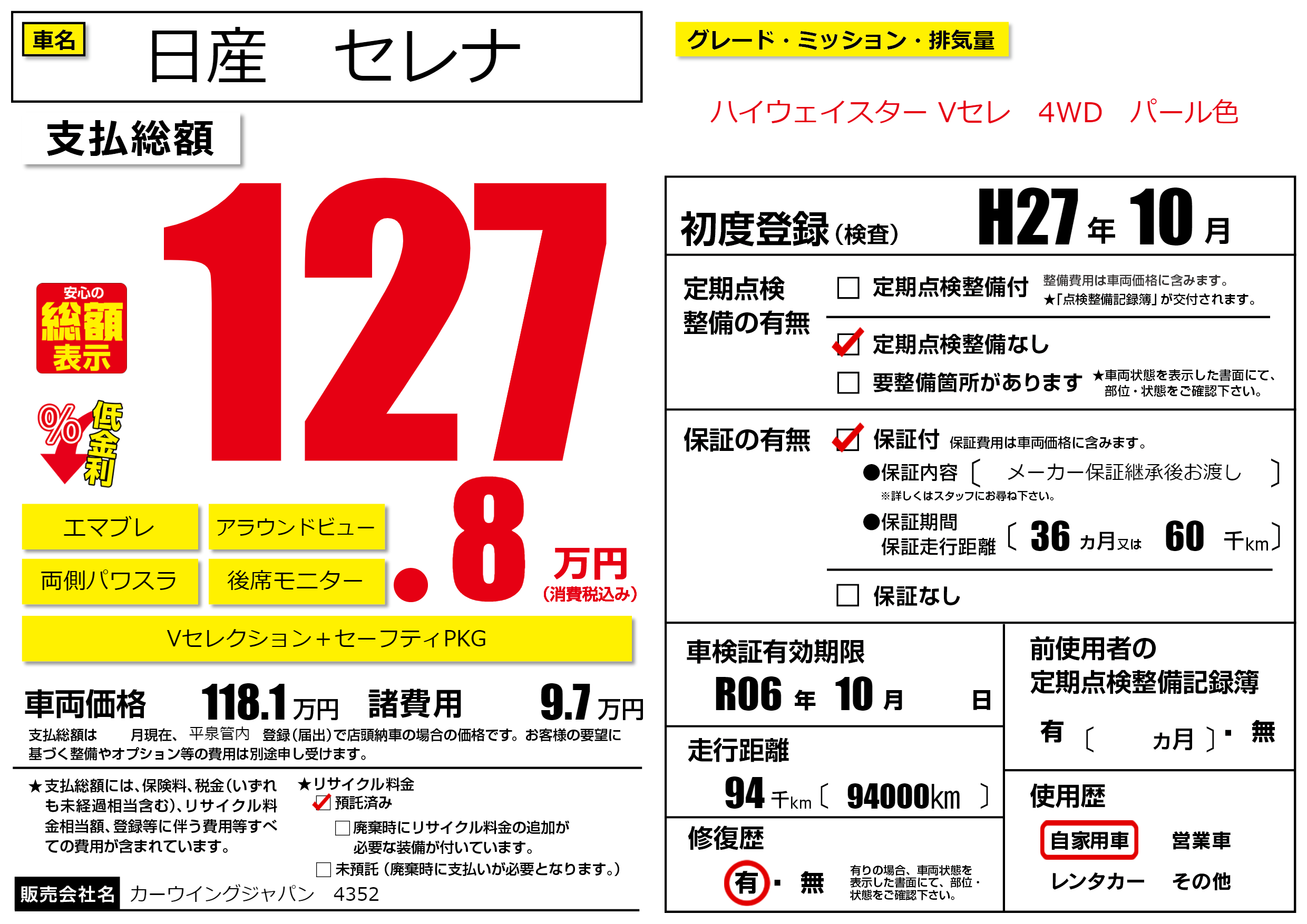 | 車名 | 日産 セレナ | グレード ミッション 排気量 |