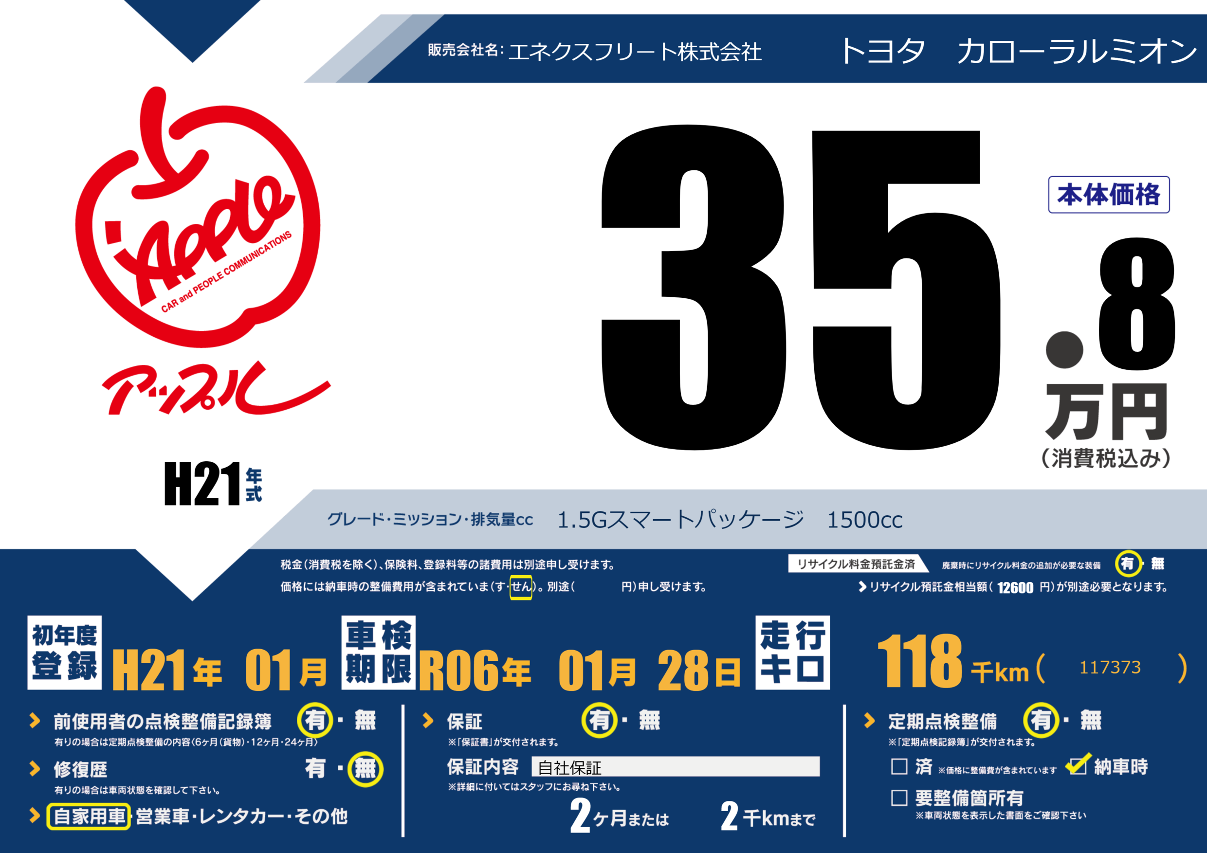 | 車名 | トヨタ カローラルミオン | グレード ミッション 排気量 |