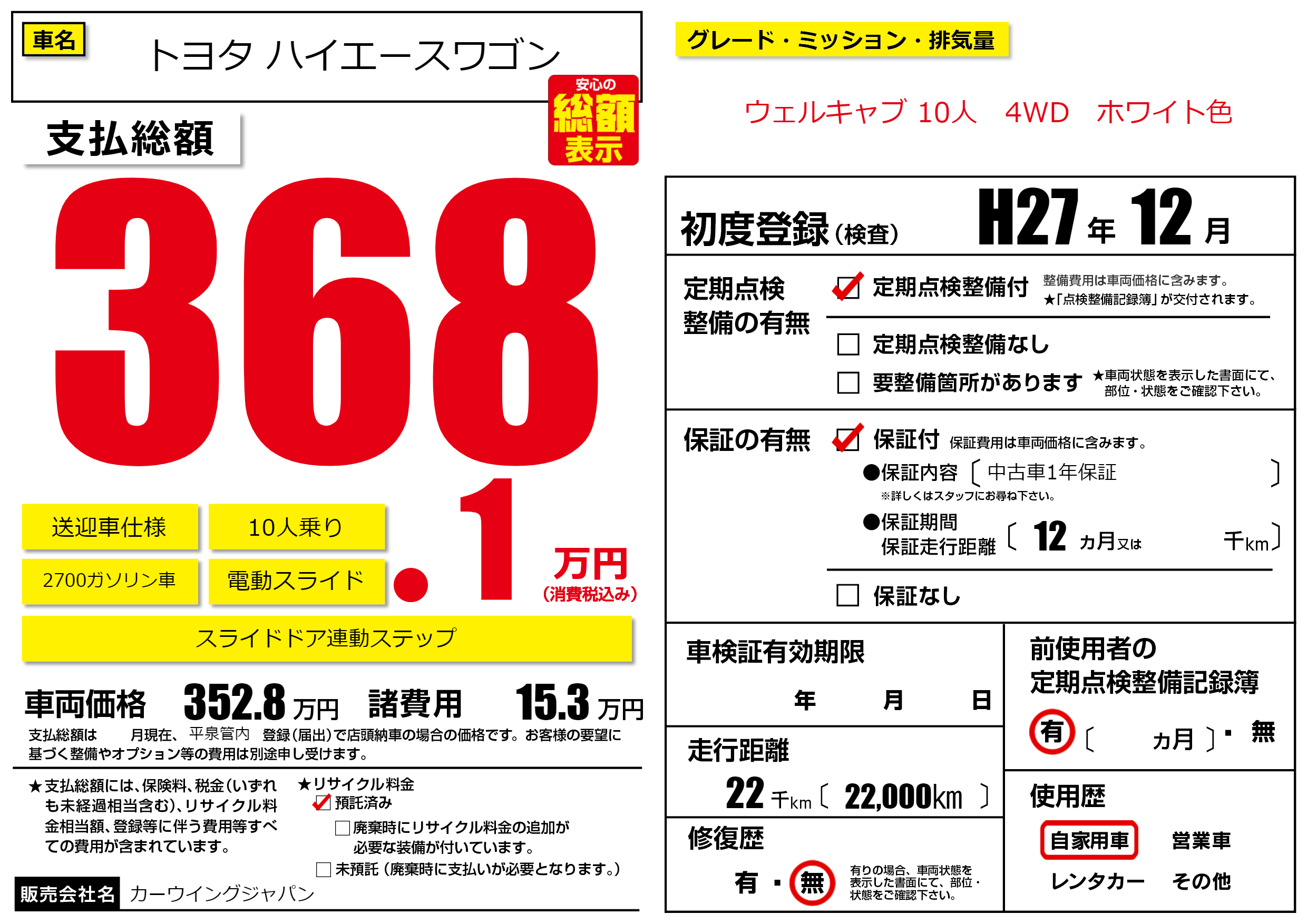 ウェルキャブ 10人 4WD ホワイト色 |
