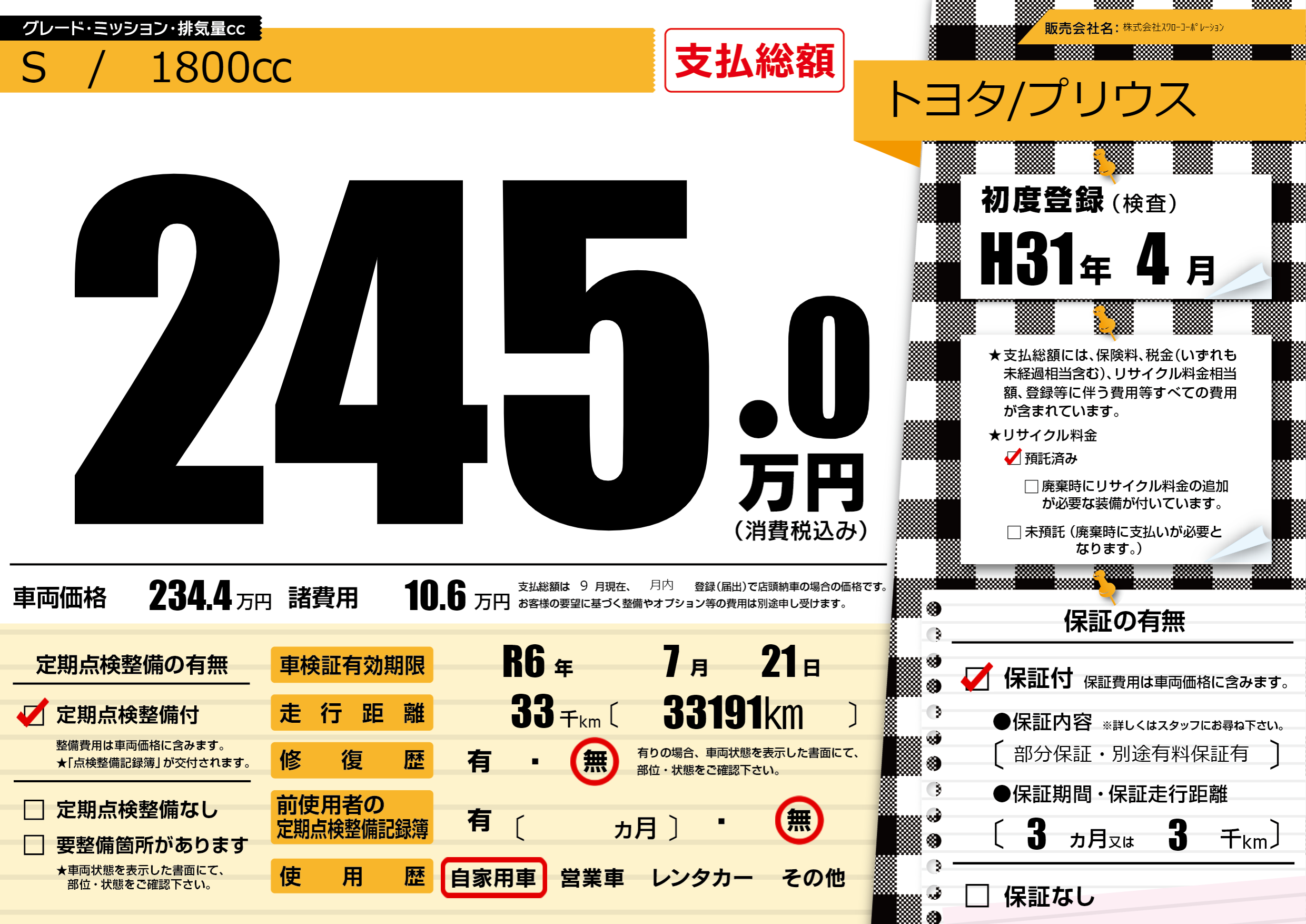 保証付き 保証内容(部分保証・別途有料保証有) 3ヶ月または(3)千kmまで |