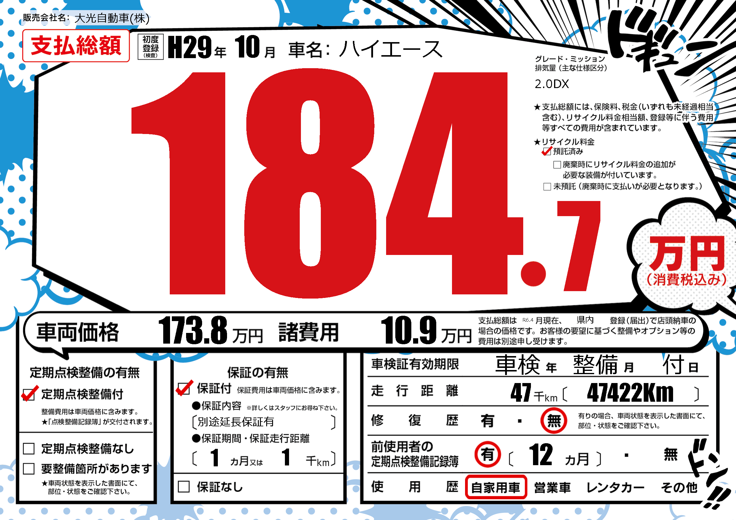 | 車名 | ハイエース | グレード ミッション 排気量 |