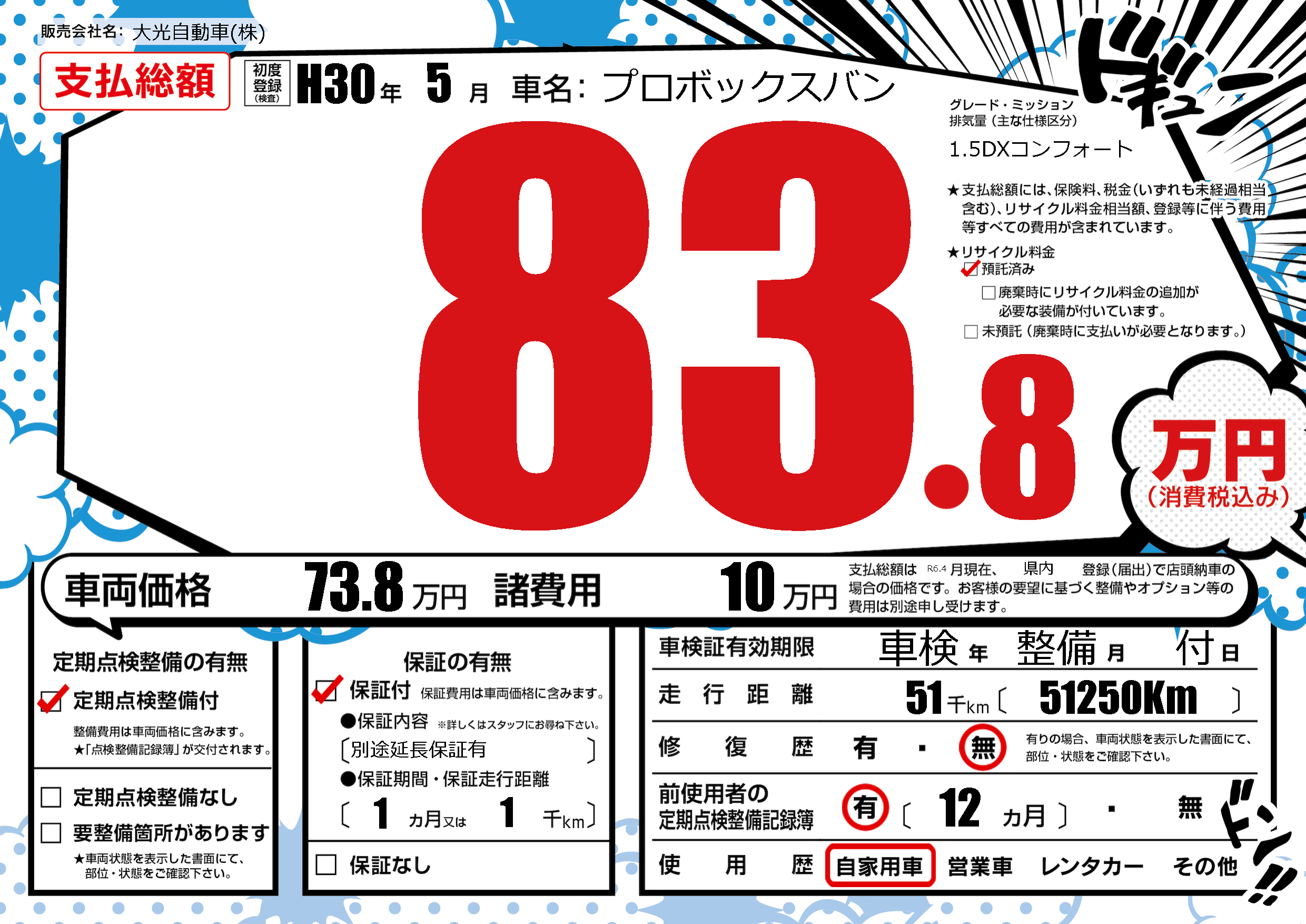 | 車名 | プロボックスバン | グレード ミッション 排気量 |
