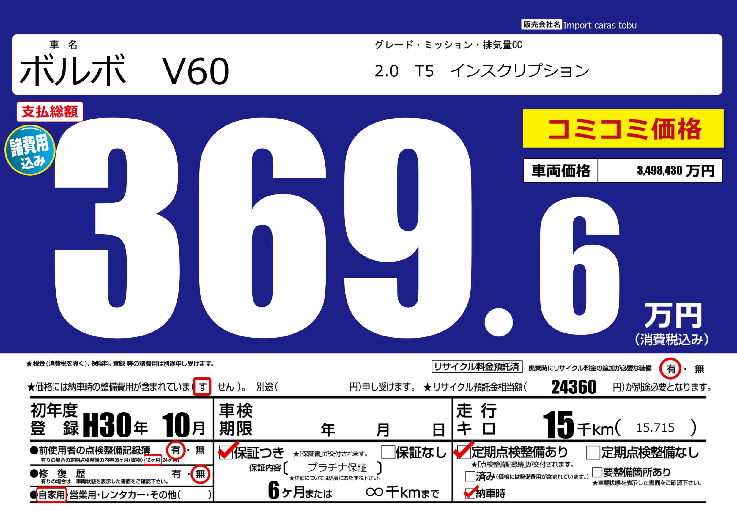 保証付き 保証内容( プラチナ保証 ) 6ヶ月または(∞)千kmまで |