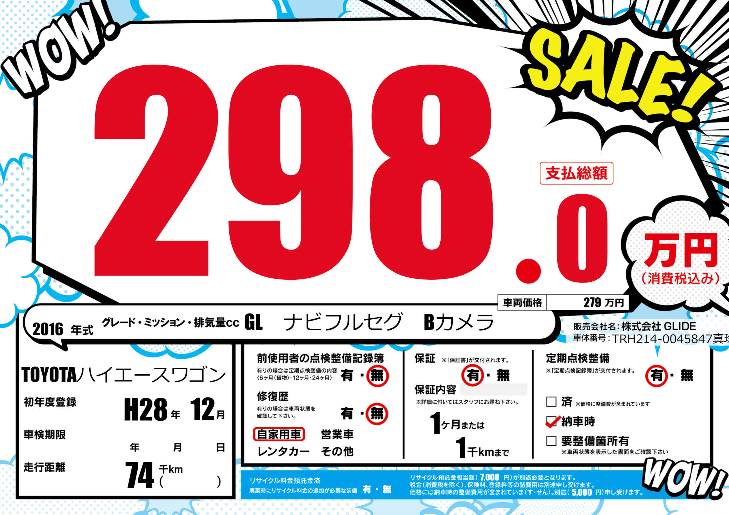| 車名 | TOYOTAハイエースワゴン | グレード ミッション 排気量 |