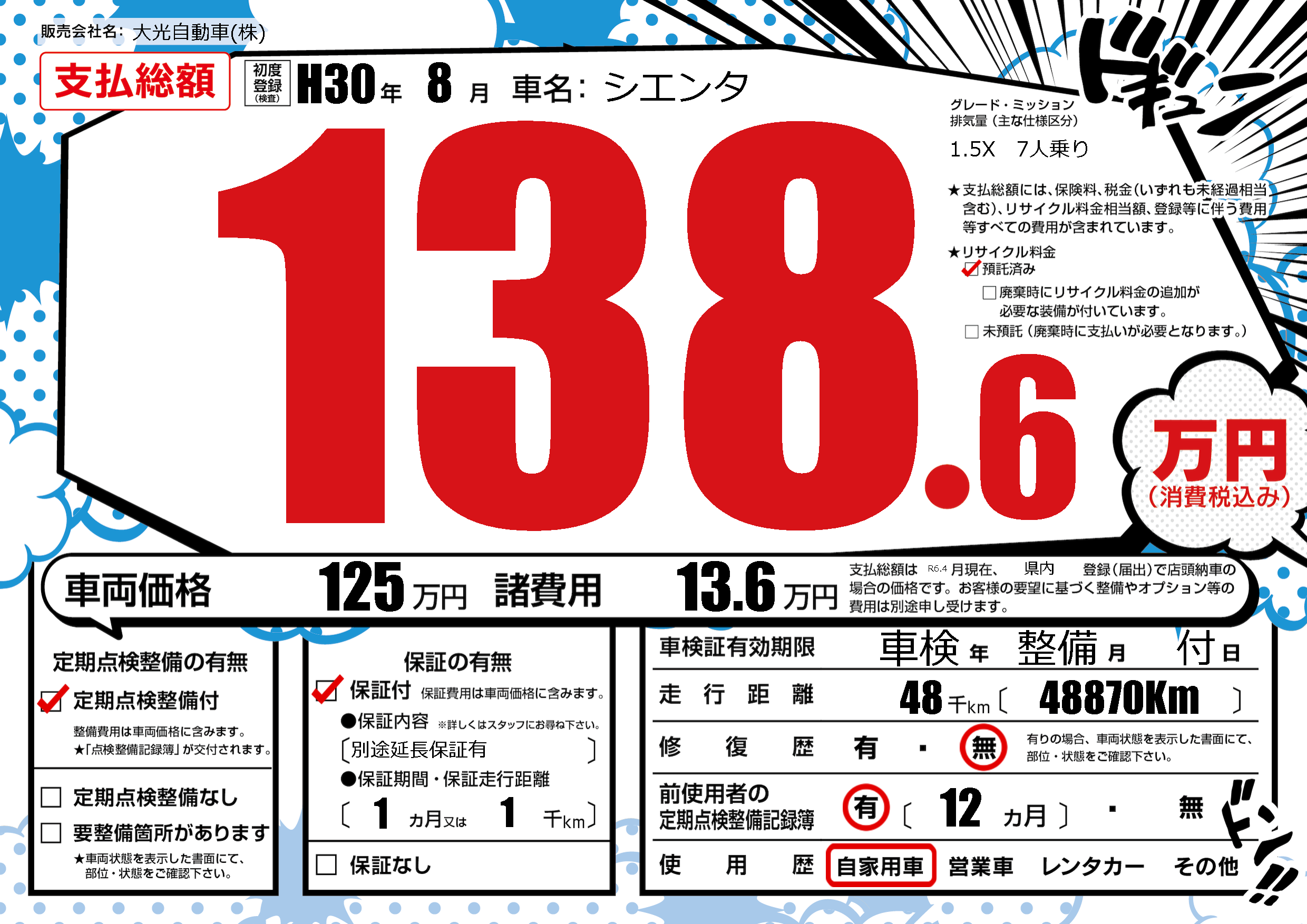 | 車名 | シエンタ | グレード ミッション 排気量 |