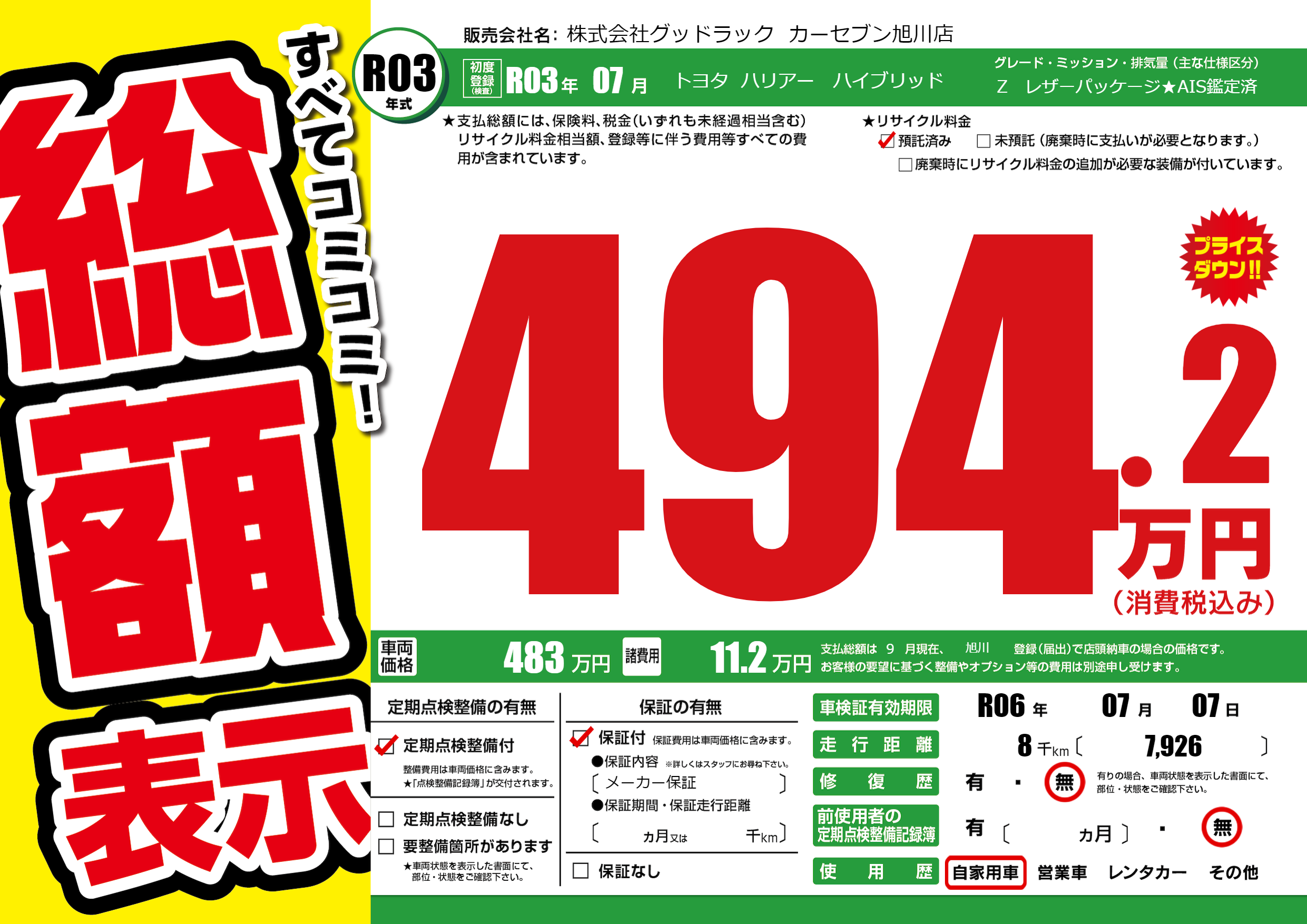 | 走行キロ | 0.8万km | 初年度登録 | R03年07月 |