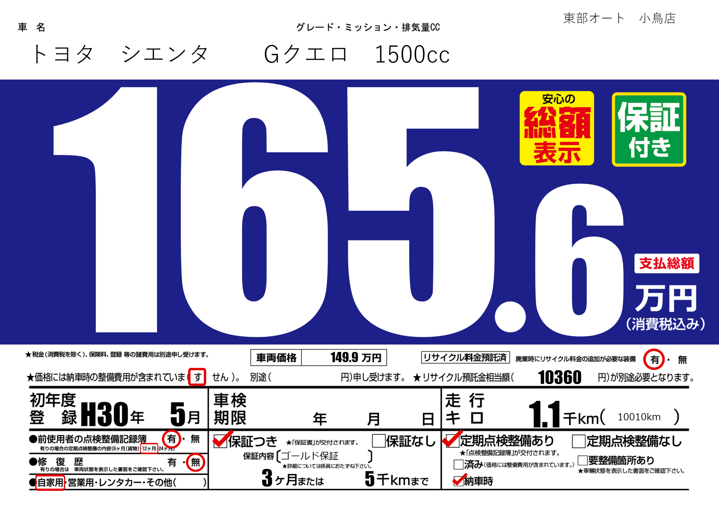 | 車名 | トヨタ シエンタ | グレード ミッション 排気量 |