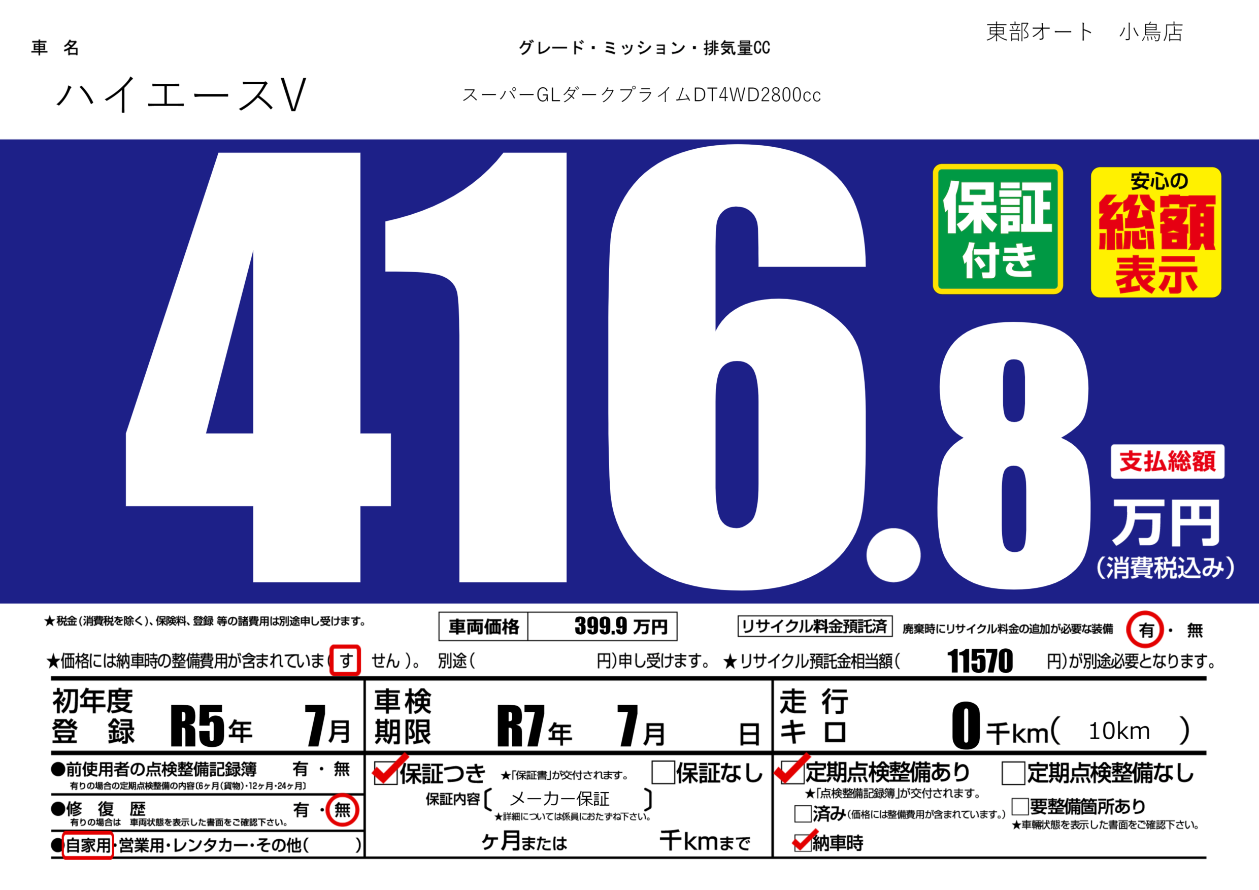 | 車名 | ハイエースV | グレード ミッション 排気量 |