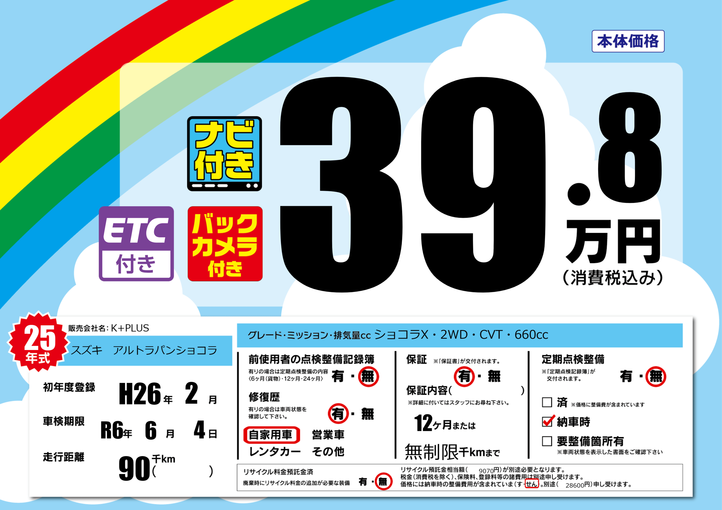 | 定期点検整備 | 定期点検整備なし 納車時あり | ||