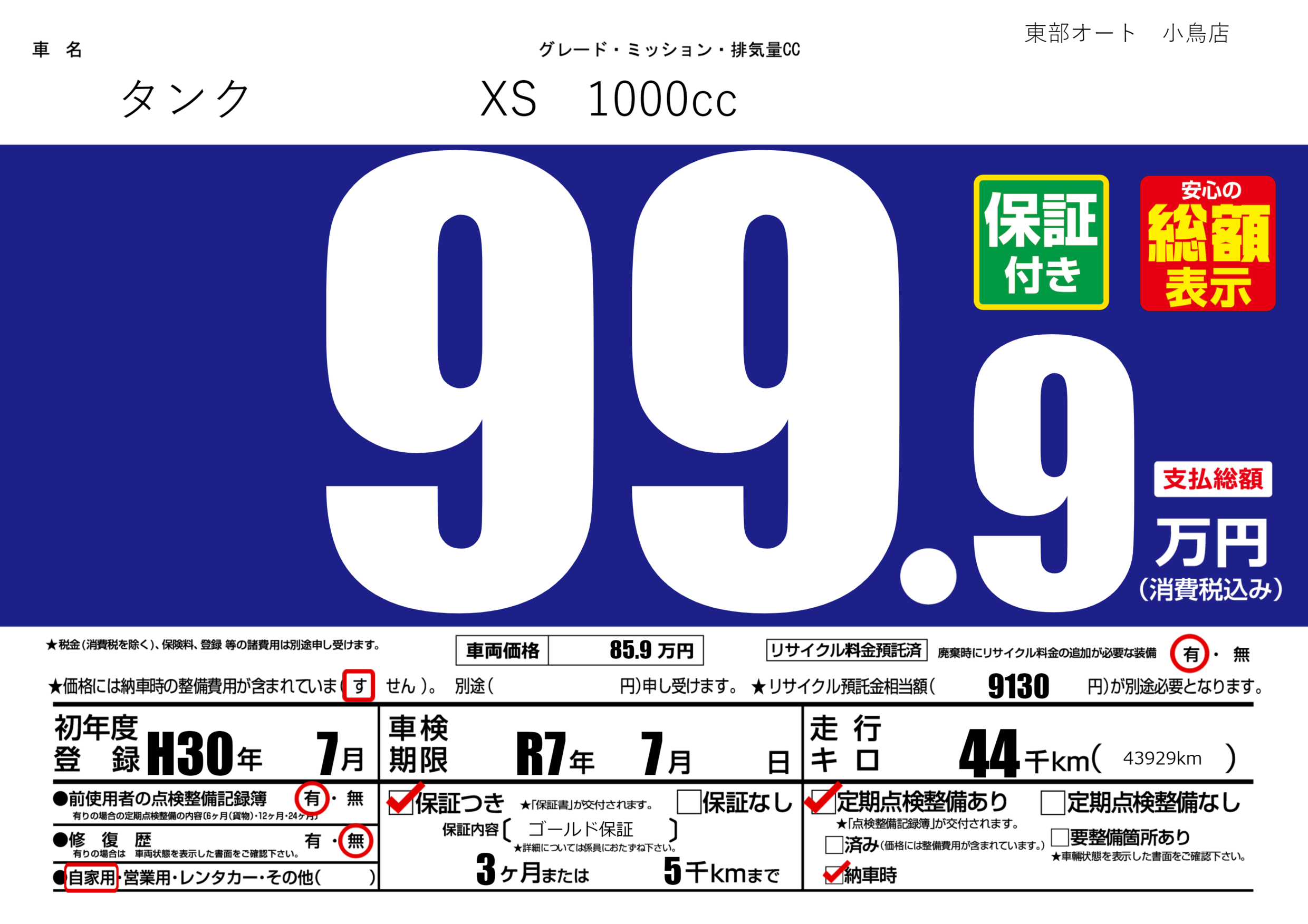 保証付き 保証内容( ゴールド保証) 3ヶ月または5千km |