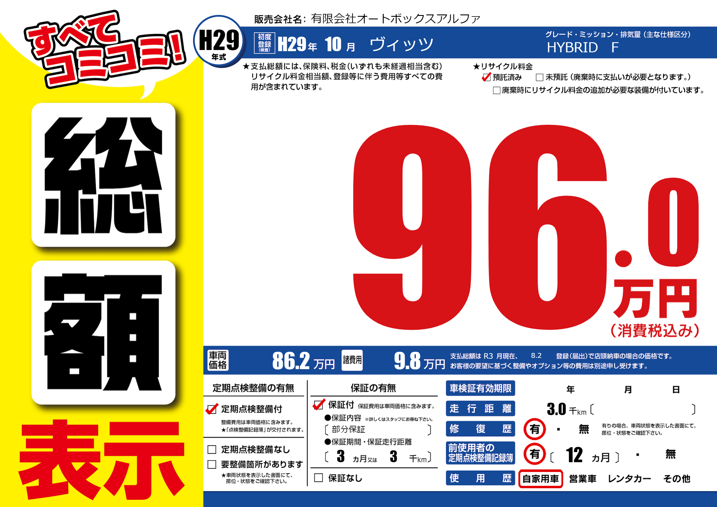 | 車名 | ヴィッツ | グレード ミッション 排気量 |