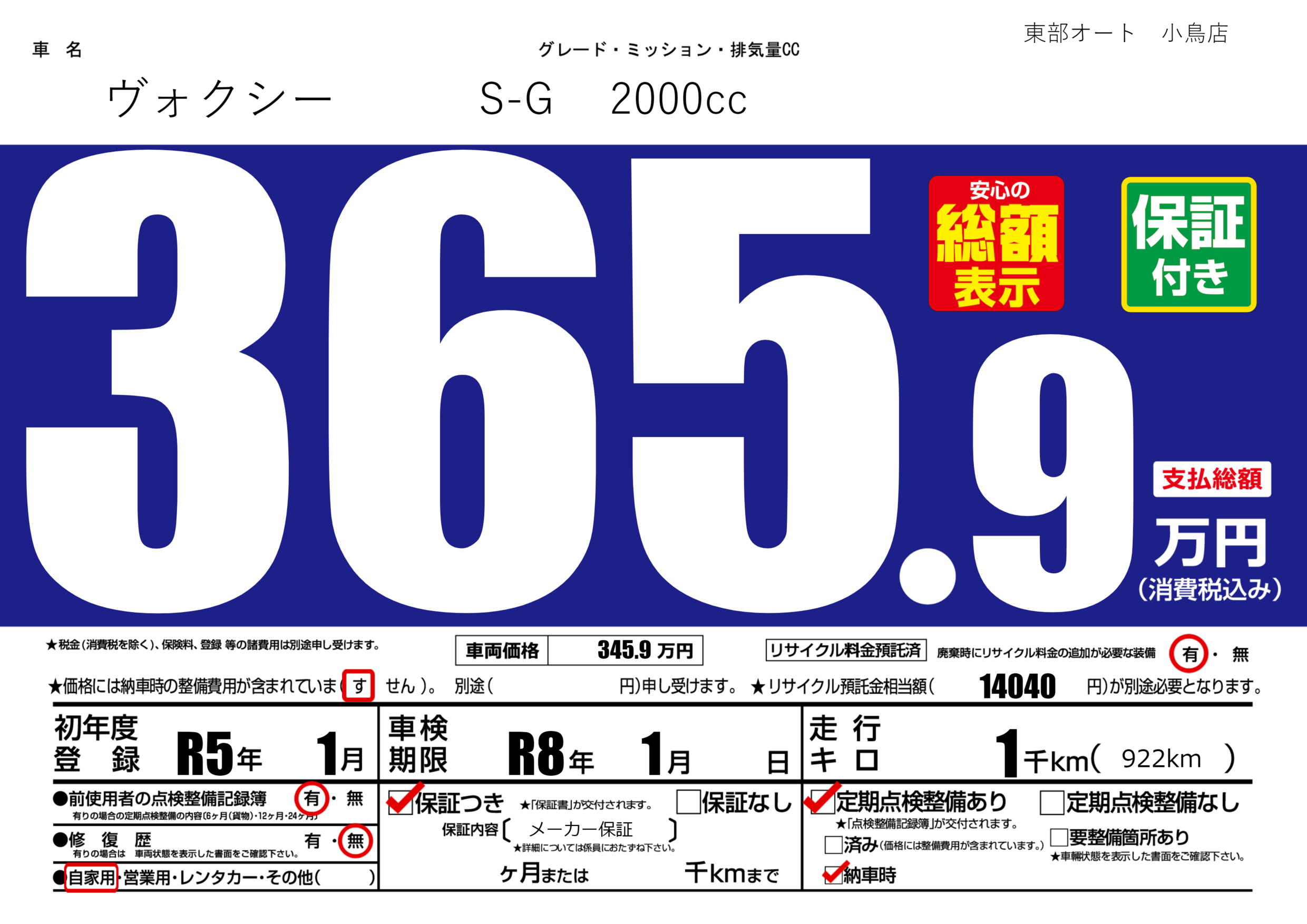 保証付き 保証内容( メーカー保証) ---ヶ月または()千kmまで |