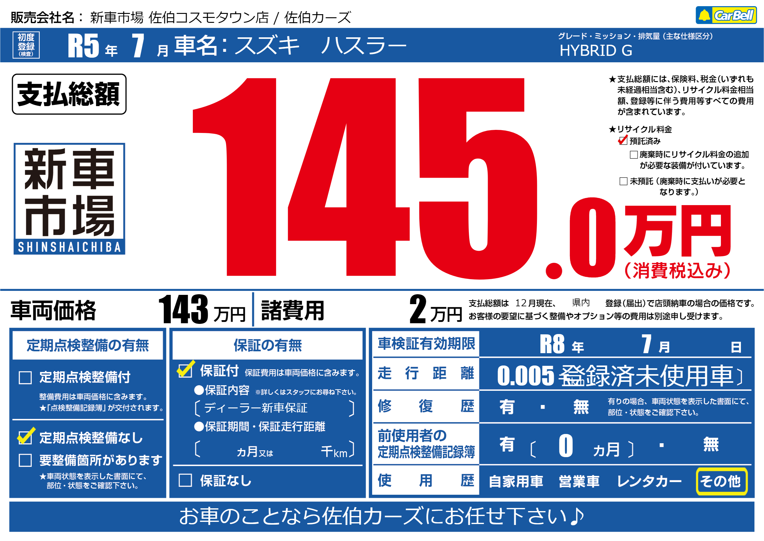 | 車名 | スズキ ハスラー | グレード ミッション 排気量 |