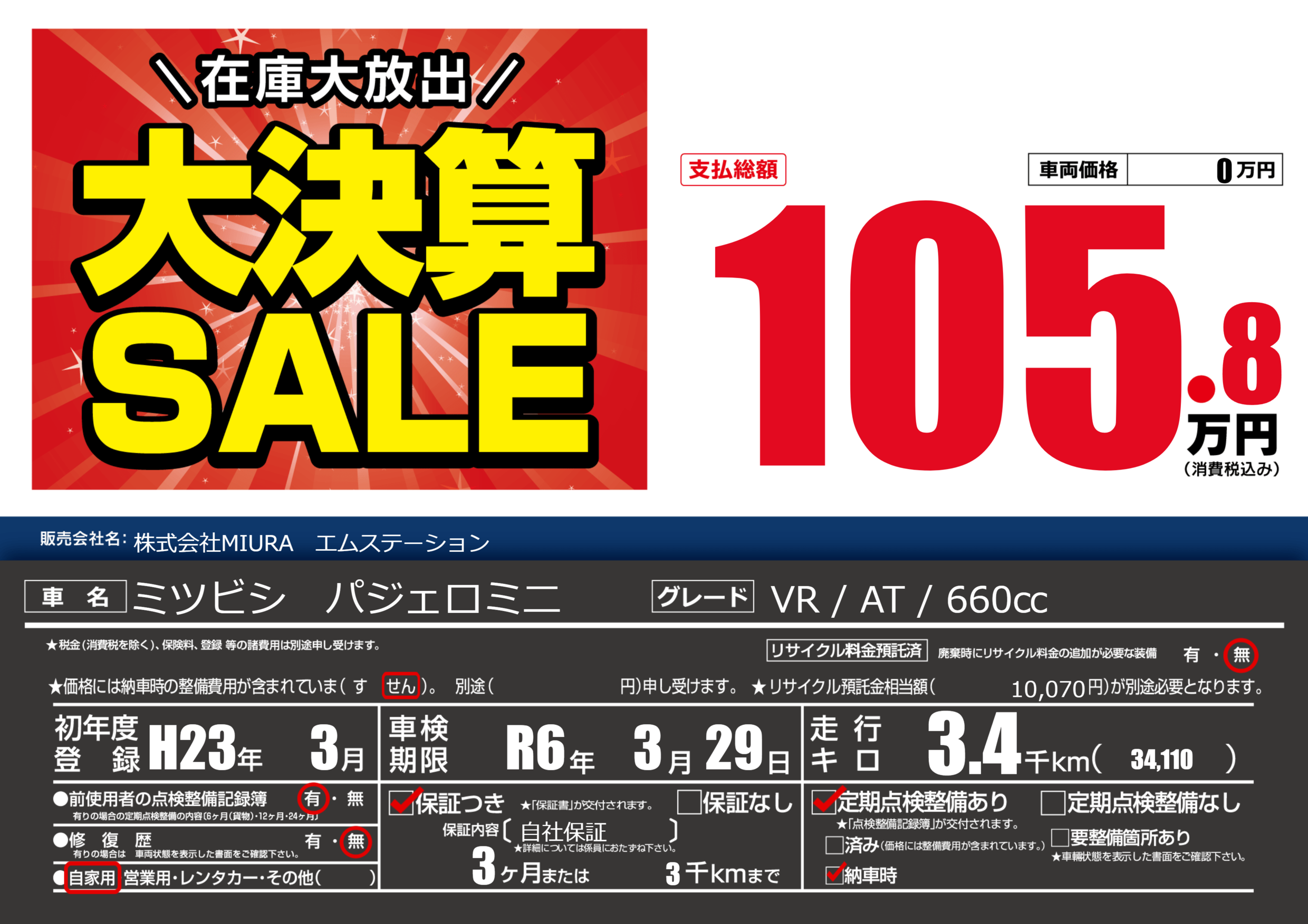 | 車名 | ミツビシ パジェロミニ | グレード ミッション 排気量 |