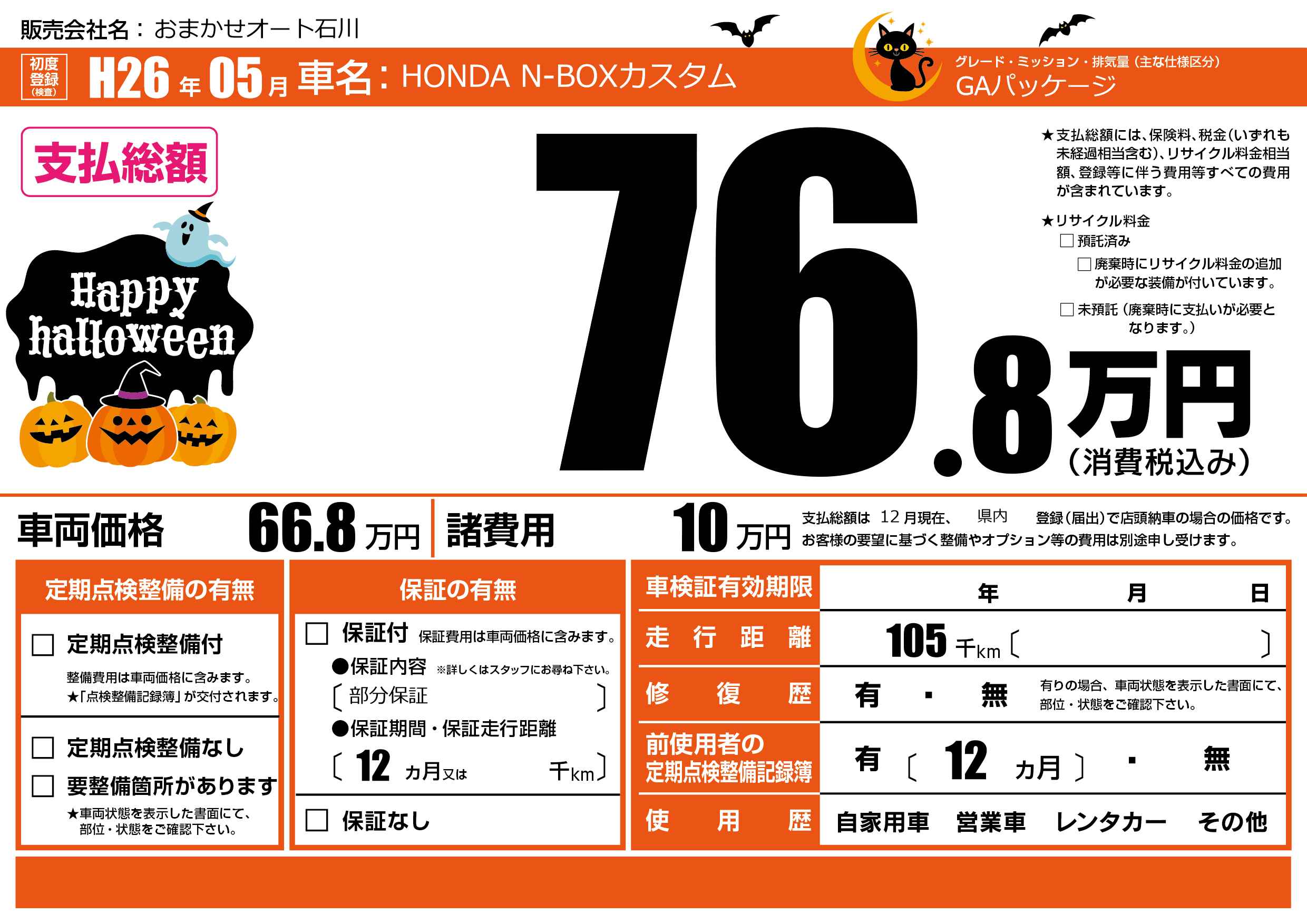 | 車名 | HONDA N-BOXカスタム | グレード ミッション 排気量 |