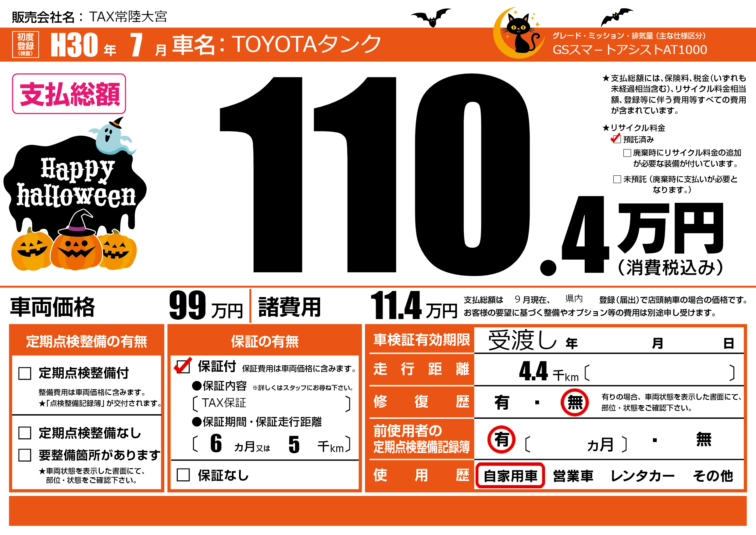保証付き 保証内容(TAX保証) 6ヶ月または(5)千kmまで |