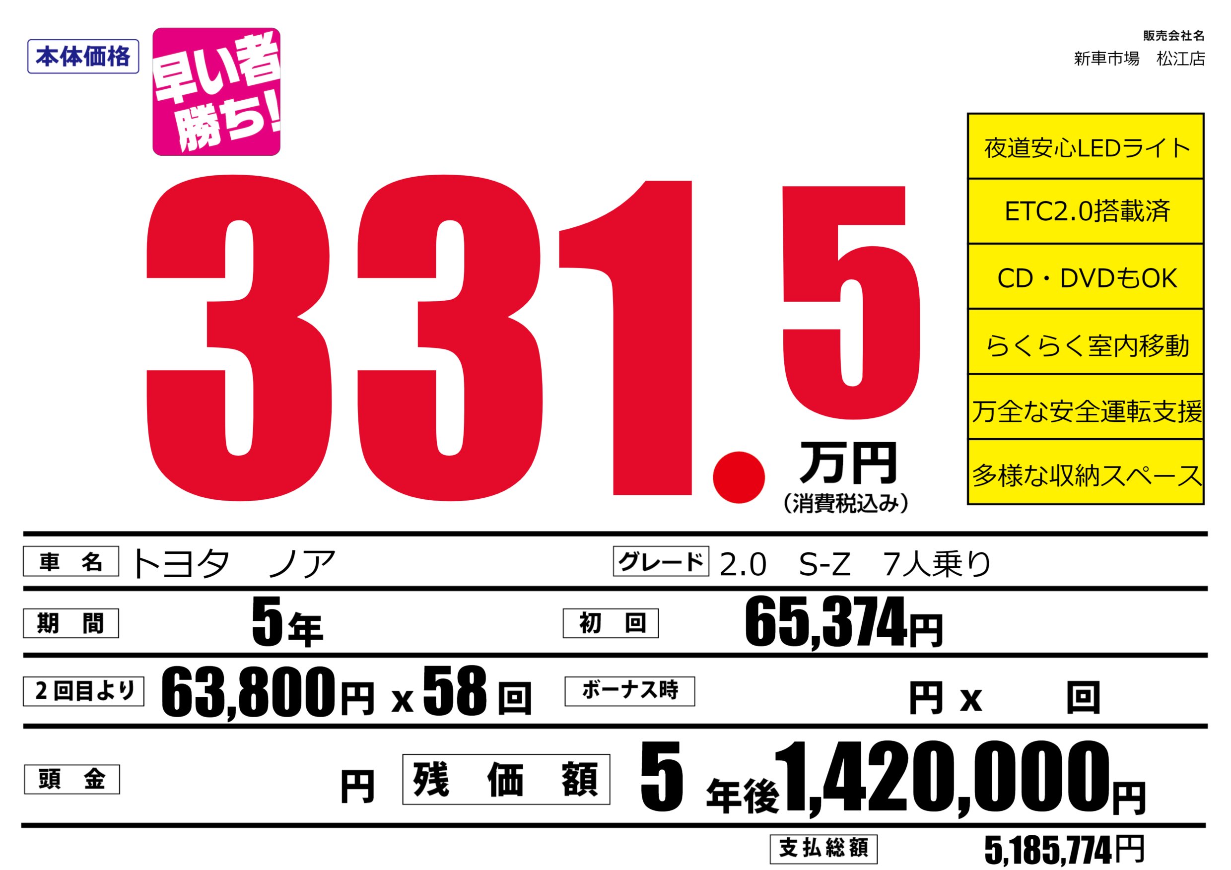 | 車名 | トヨタ ノア | グレード ミッション 排気量 |
