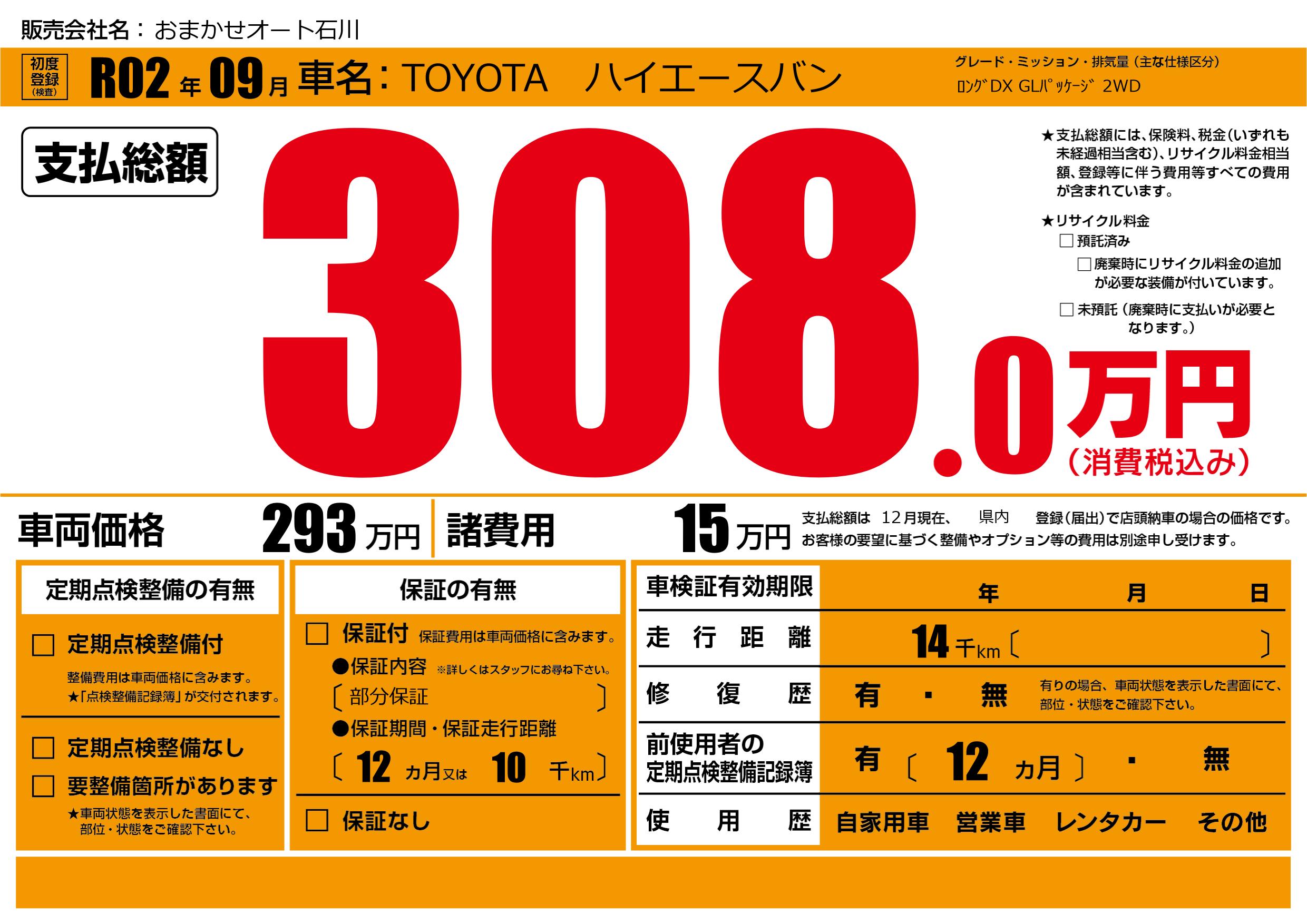 | 車名 | TOYOTA ハイエースバン | グレード ミッション 排気量 |