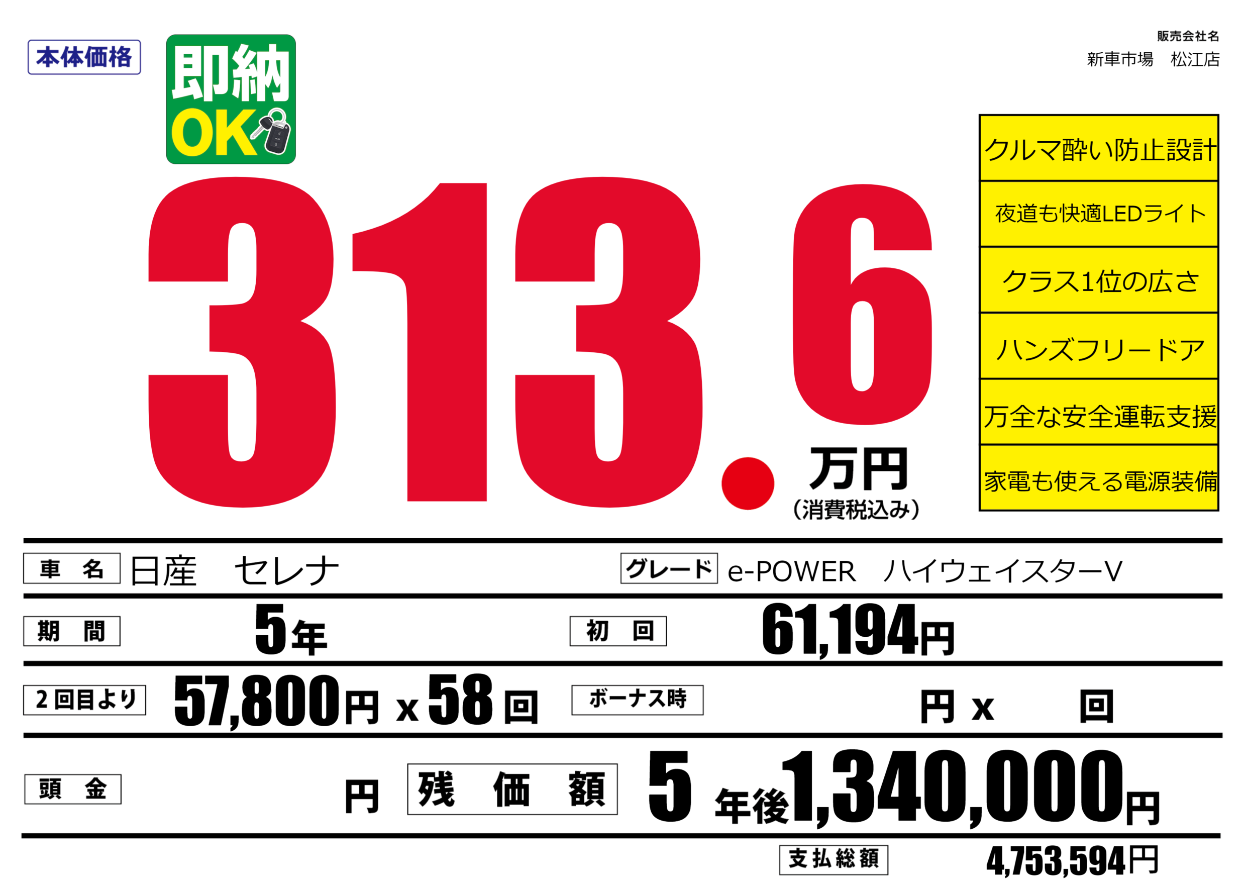 | 車名 | 日産 セレナ | グレード ミッション 排気量 |