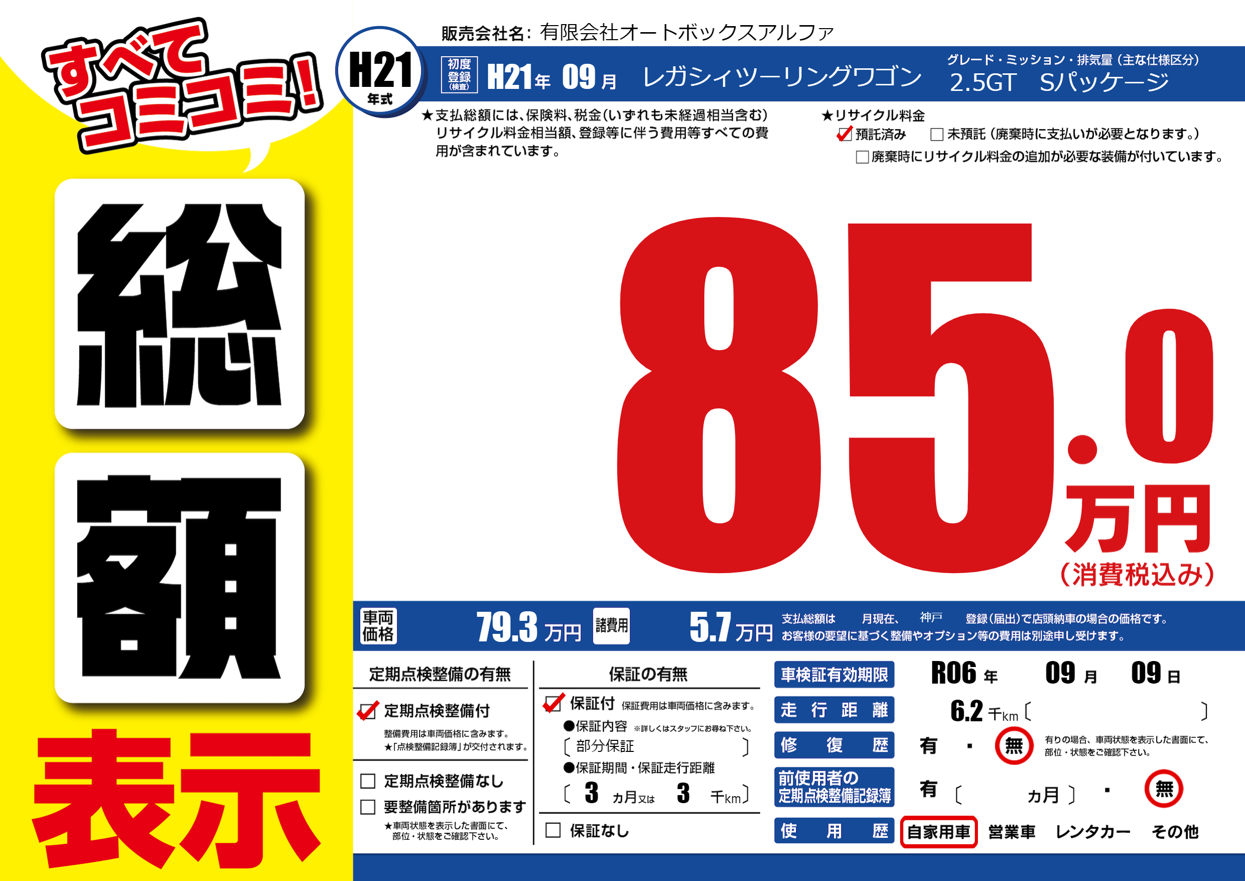 | 車名 | レガシィツーリングワゴン | グレード ミッション 排気量 |