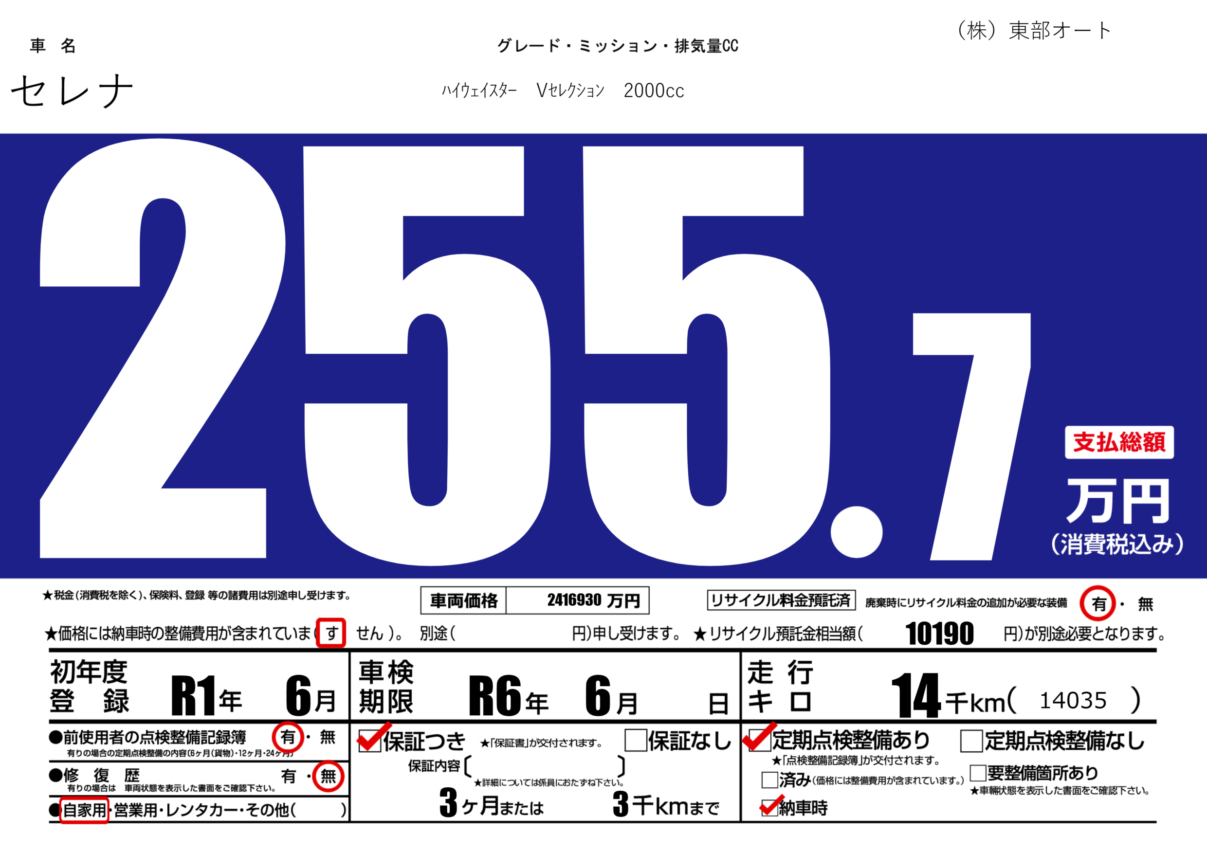 | 定期点検整備 | 定期点検整備あり 納車時あり | ||