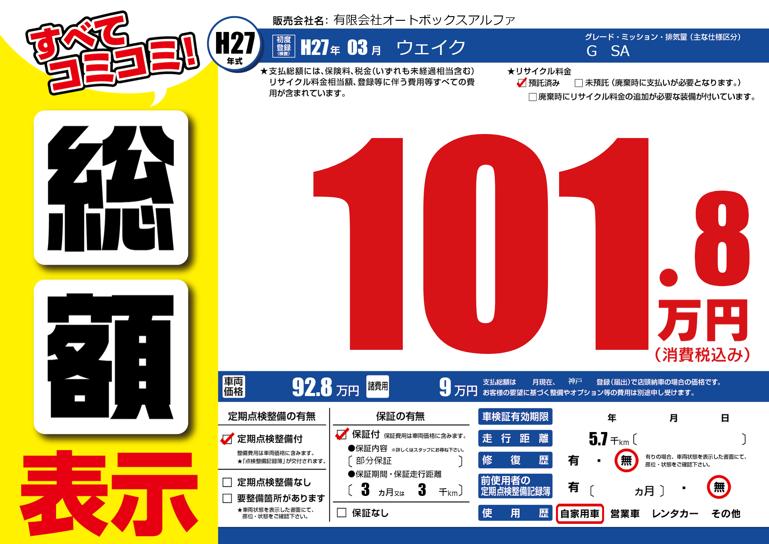 保証付き 保証内容(部分保証) 3ヶ月または(3)千kmまで |