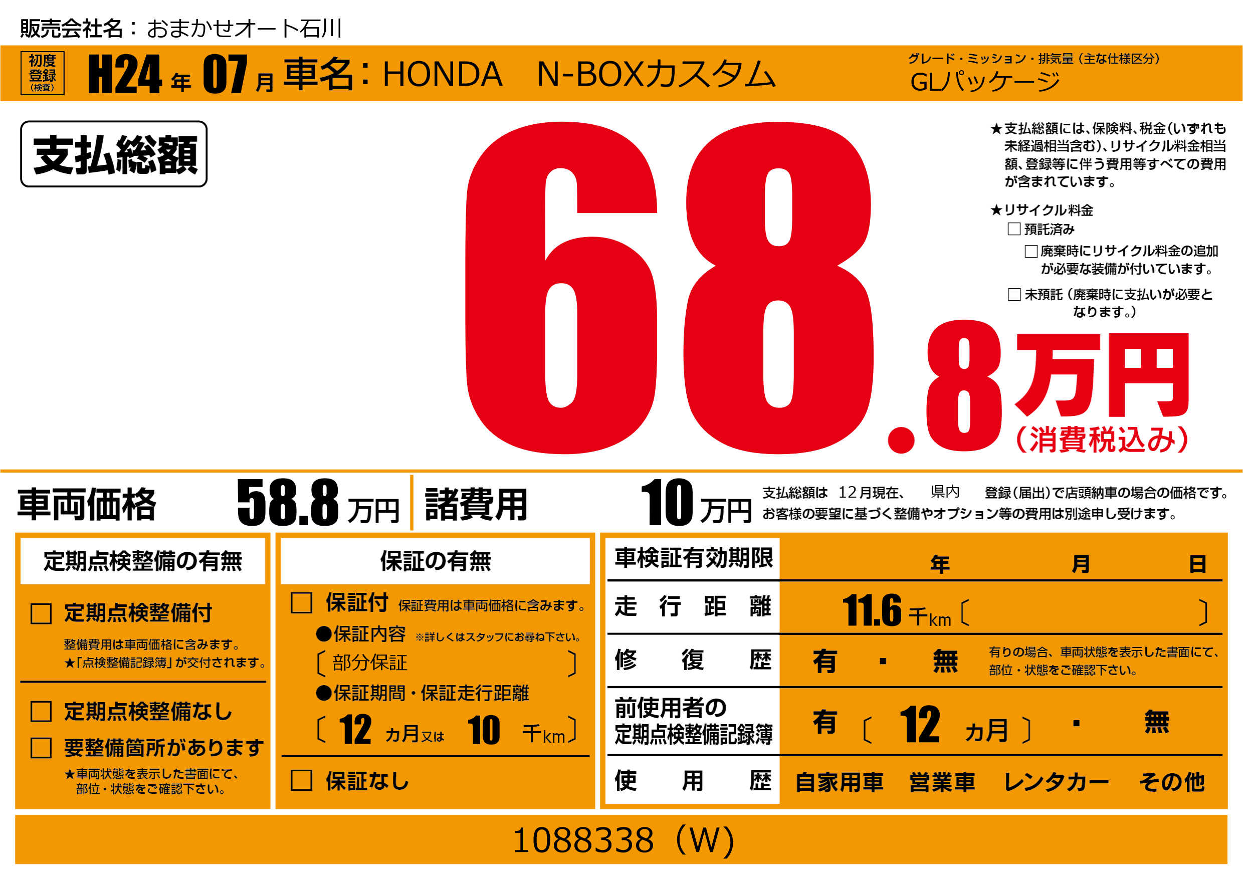 | 車名 | HONDA N-BOXカスタム | グレード ミッション 排気量 |