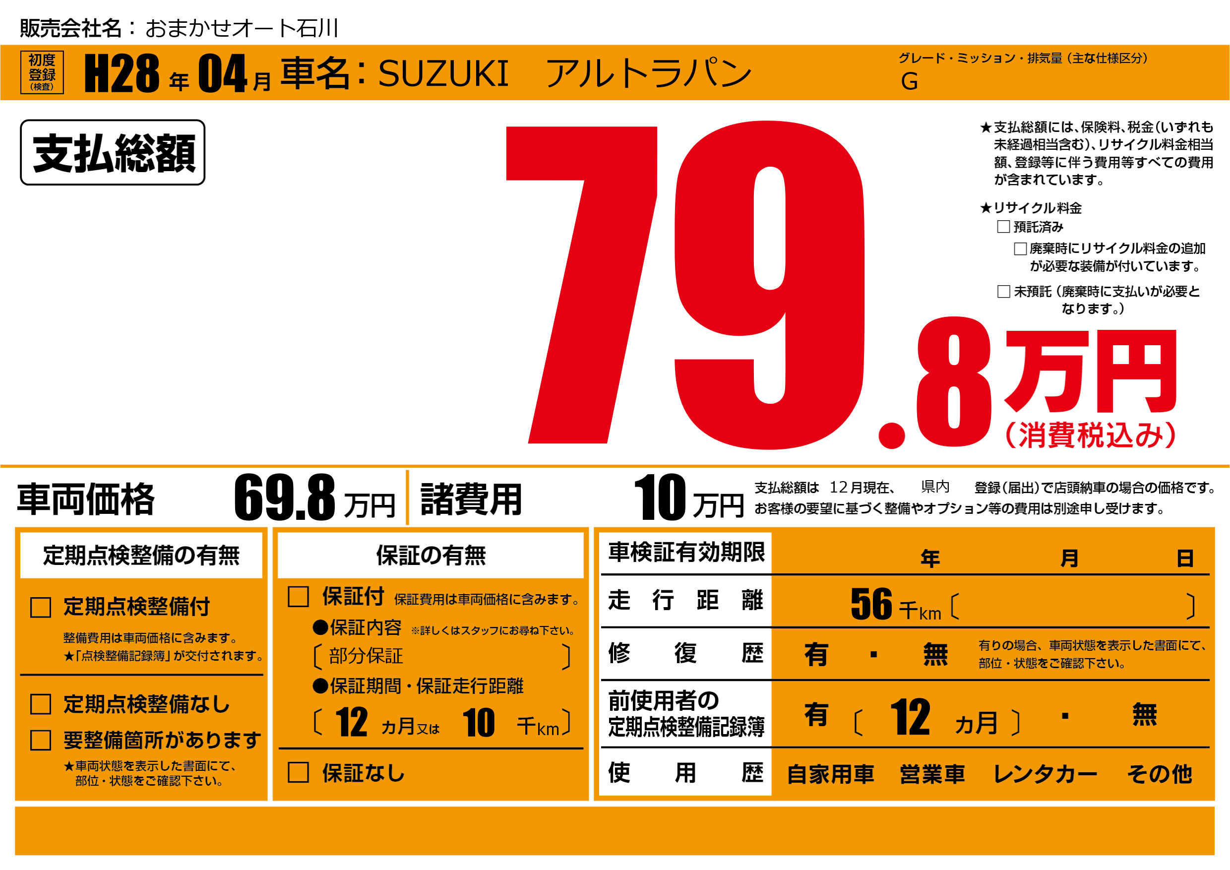 | 車名 | SUZUKI アルトラパン | グレード ミッション 排気量 |