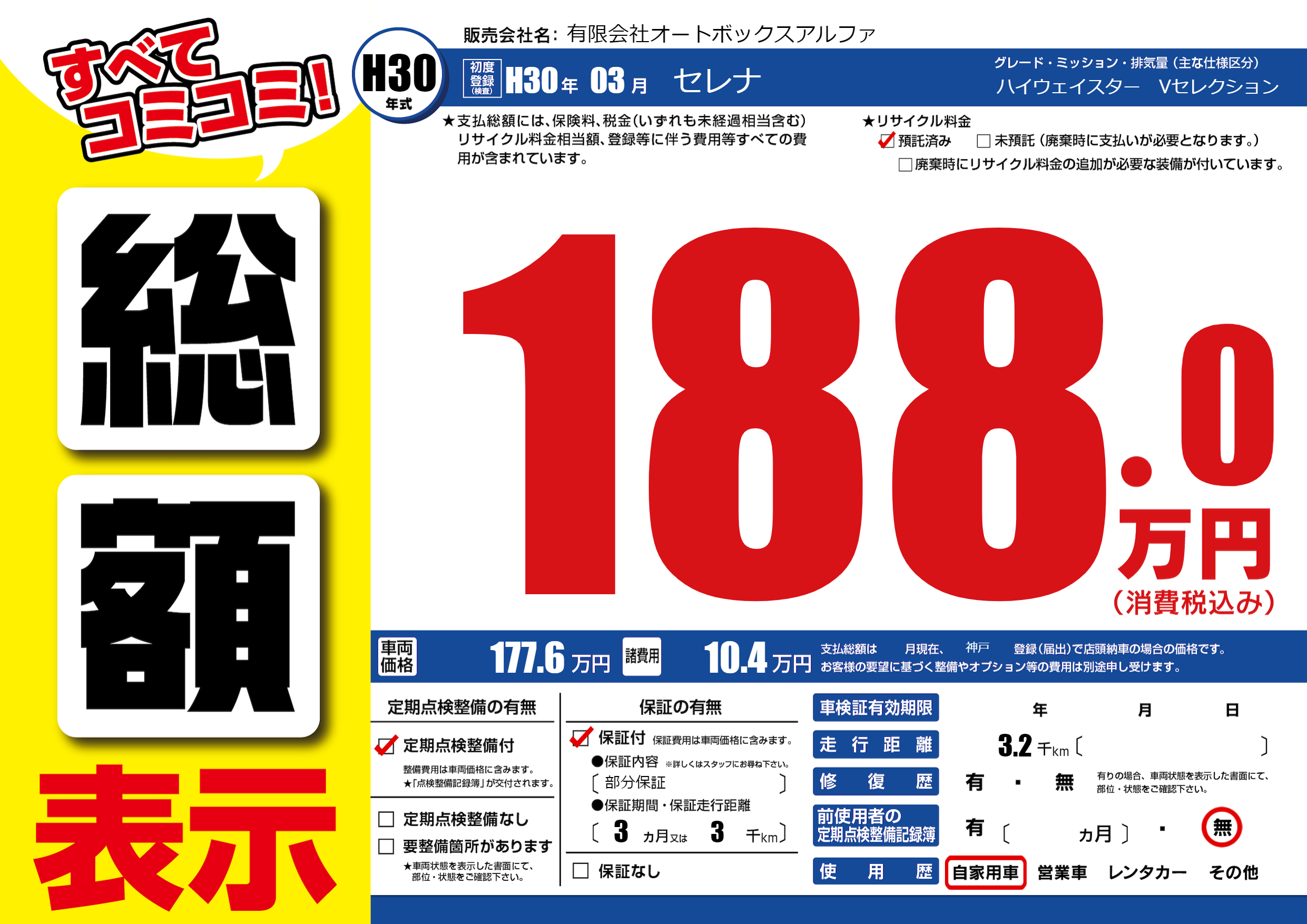 | 走行キロ | 0.3万km | 初年度登録 | H30年03月 |